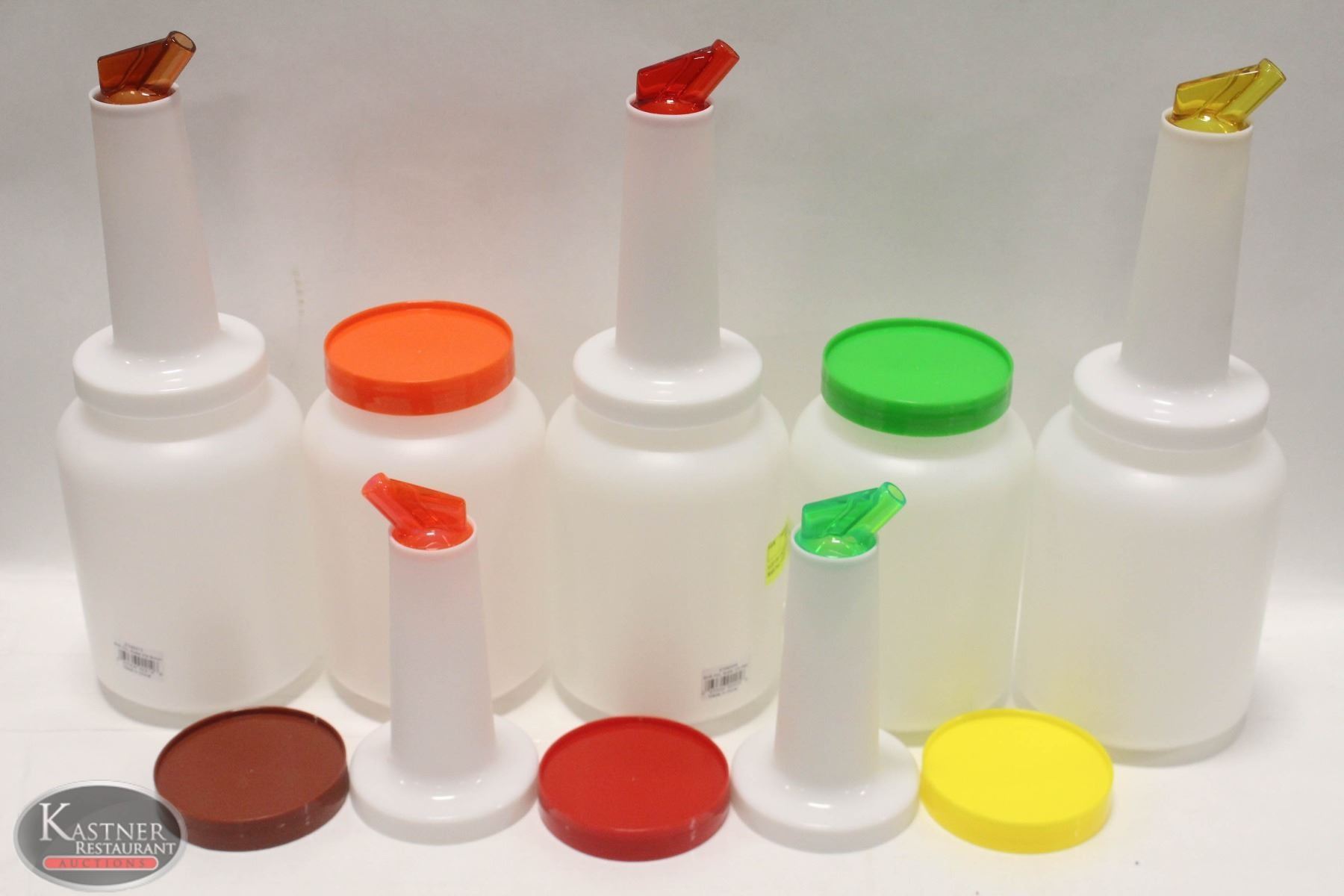 CONTAINERS. EACH COMES WITH 2 LIDS, ONE WITH A SPOUT AND ONE JAR LID FOR STORAGE (10 LIDS TOTAL). BROWN, GREEN, RED, ORANGE, & YELLOW LIDS. GREAT FOR COCKTAIL MIXES, PANCAKE BATTER, BROTHS, & MORE.