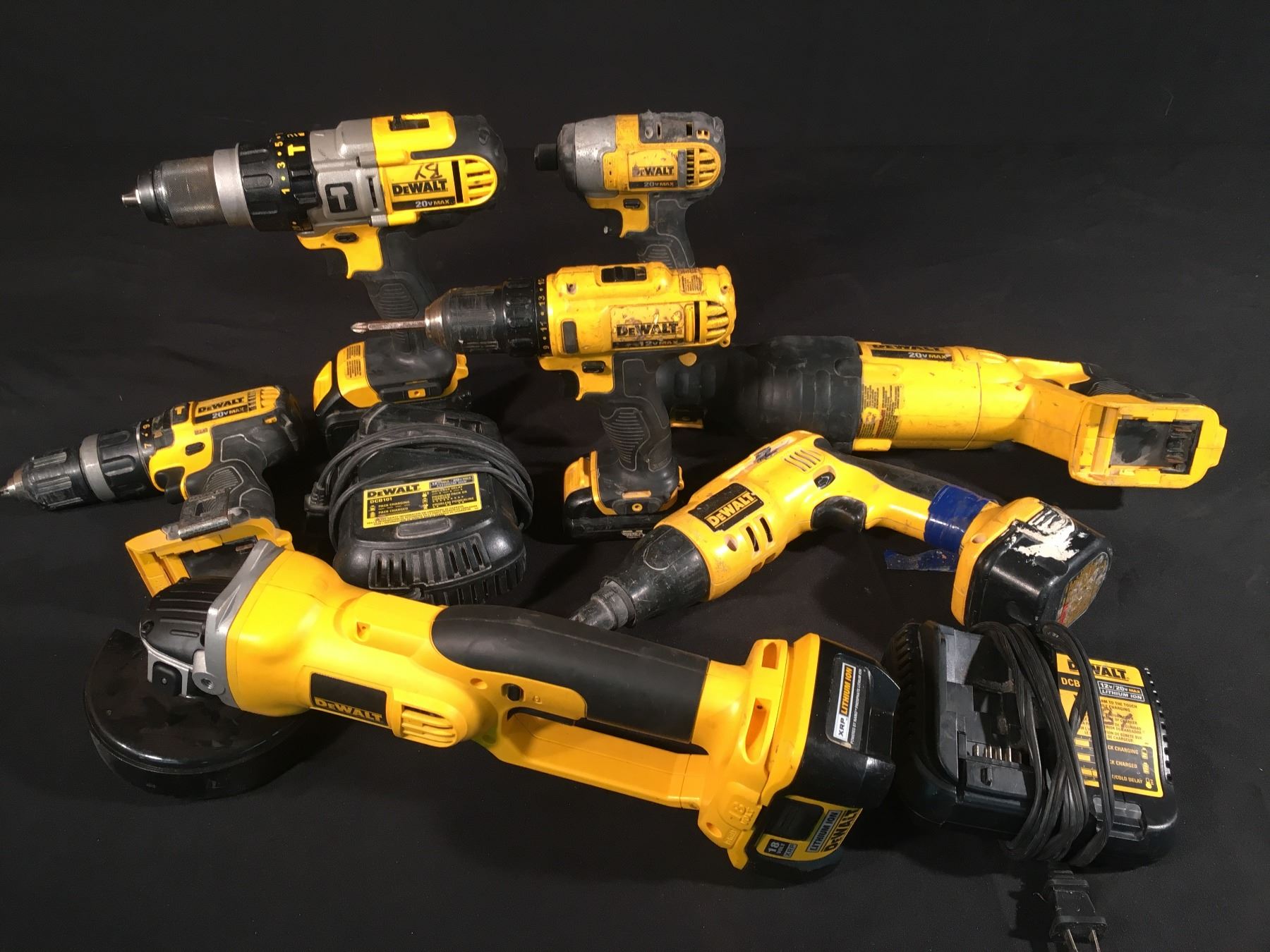 LOT OF ASSORTED DEWALT POWER TOOLS: 5 DRILLS, GRINDER, SAWZALL, 4 BATTERIES & 2 CHARGERS