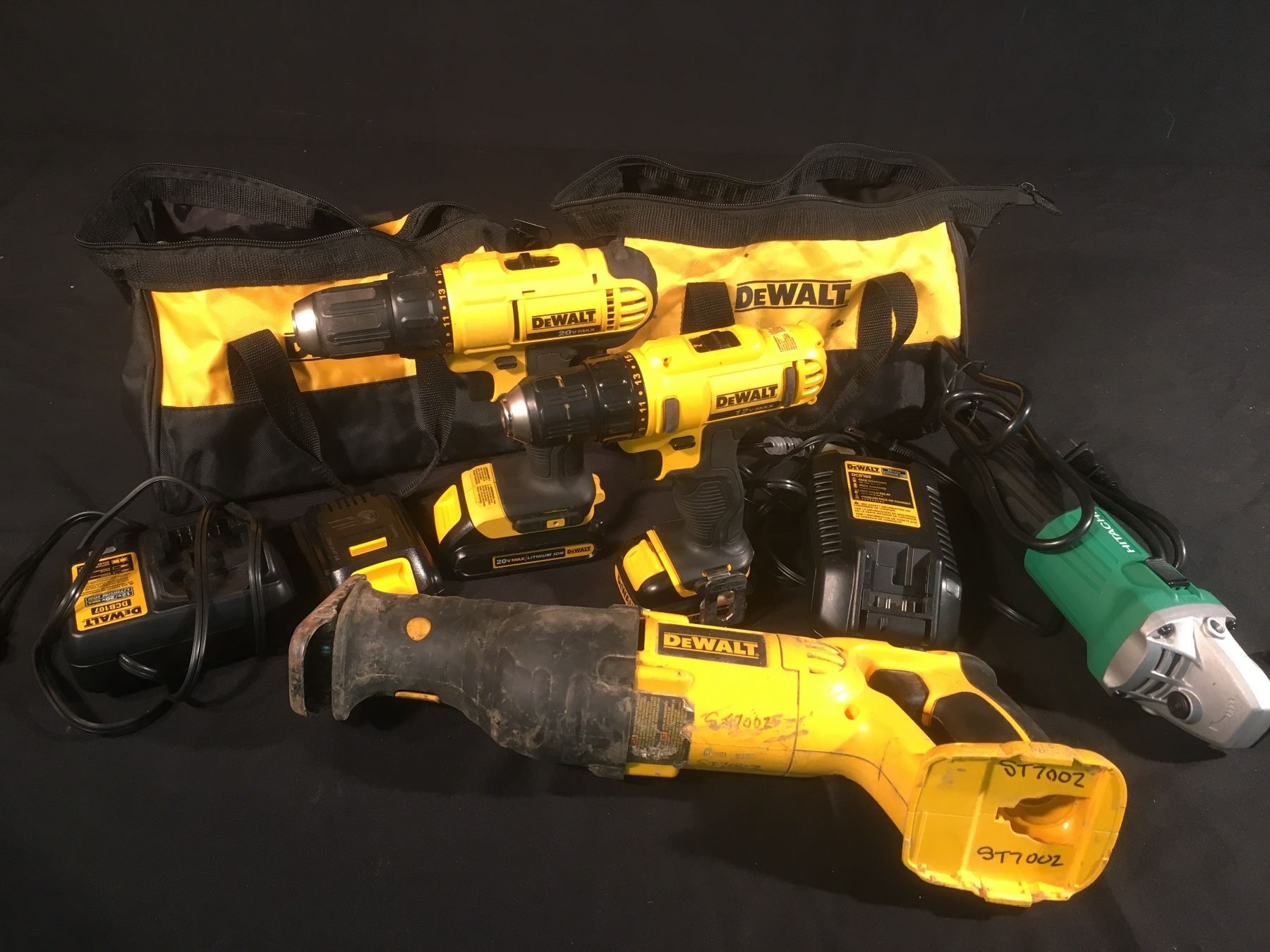 LOT OF ASSORTED POWER TOOLS: 2 DEWALT DRILLS WITH 3 BATTERIES, DEWALT SAWZALL & HITACHI GRINDER