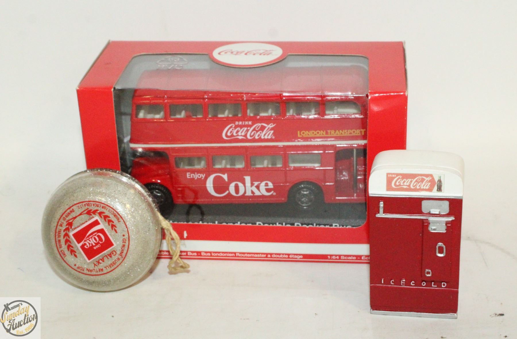 DIECAST LONDON BUS & POP MACHINE FIGURINE **ALL ITEMS MUST BE REMOVED BY 5PM SATURDAY, AUGUST 9 2025. ALL REMAINING ITEMS WILL BE SUBJECT TO A $6.00 PER DAY STORAGE CHARGE. ANY ITEMS REMAINING AFTER MONDAY, AUGUST 25TH 2025 WILL BE CONSIDERED FORFEITED. NO REFUNDS WILL BE ISSUED FOR FORFEITED ITEMS. TO SCHEDULE A PICK UP APPOINTMENT CLICK HERE