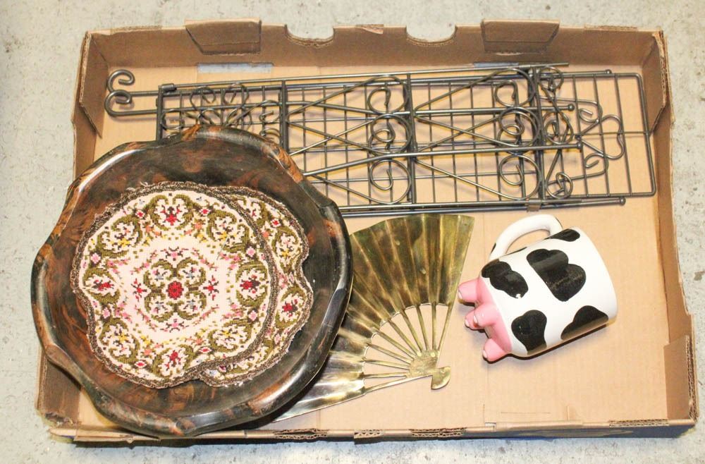 DÉCOR-FAN, SMALL METAL 3 SHELF PLANT/DÉCOR STAND, HANDMADE WOODEN FRUIT BOWL, 2 NEEDLEPOINT HOTMATS, COW CUP.