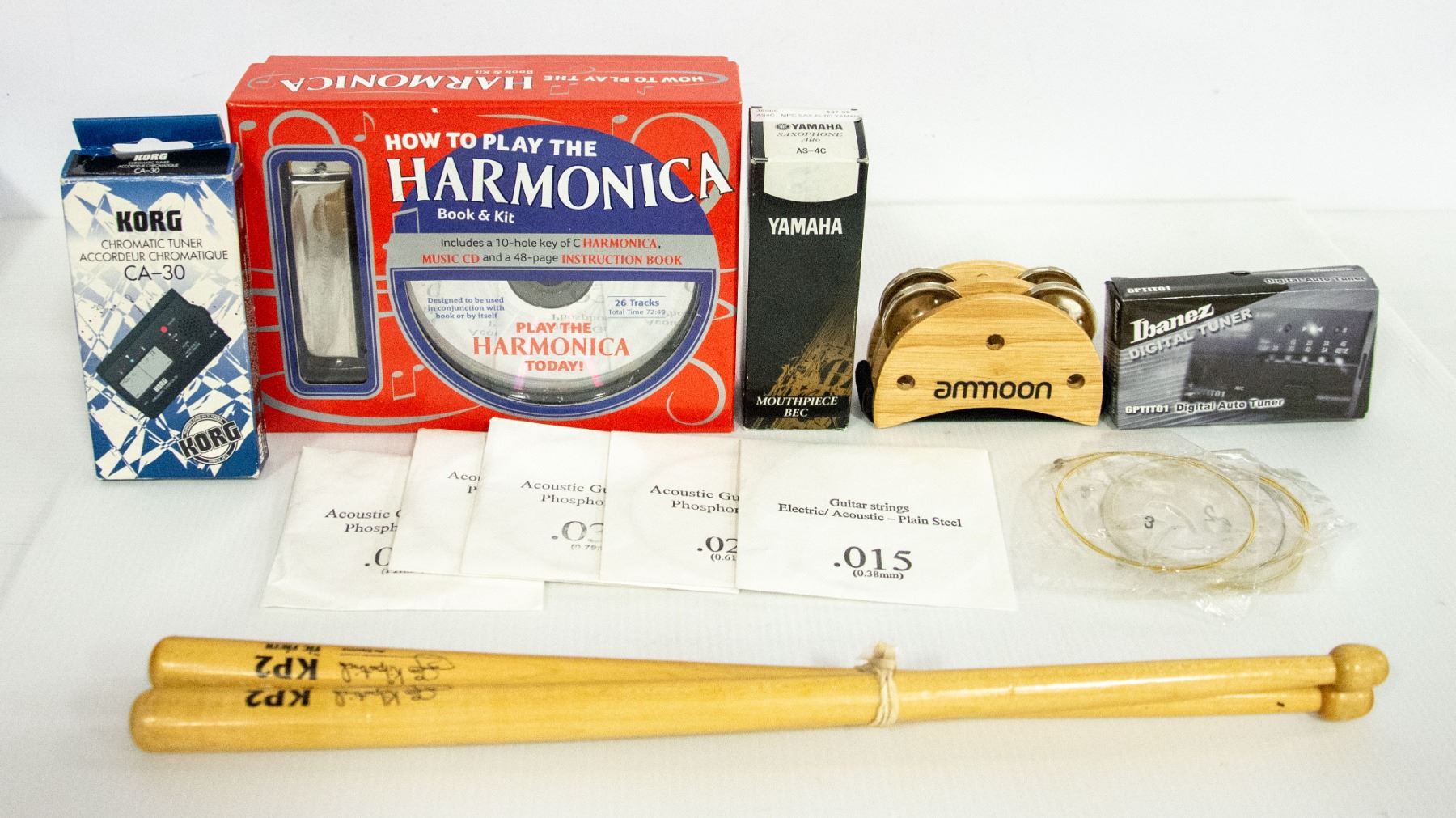 KP2 BY NRIC FIRTH (2) TUNERS KORG GUITAR CA-30 & IBANEZ DIGITAL #6PT1TOL, HOW TO PLAY THE HARMONICA. AMMOON ELLIPTICAL TAMBOURINE, YAMAHA SAXOPHONE ALTO MOUTH PIECE #AS-4C & ASSORTMENT OF NEW GUITAR STRINGS ACOUSTIC PHOSPHER BRONZE .031, 0.39, 0.24,