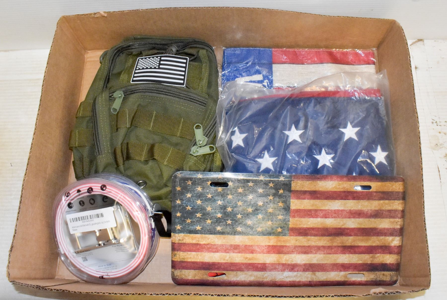 LOT OF NEW AMERICAN ITEMS - FLAG, LICENCE PLATE
