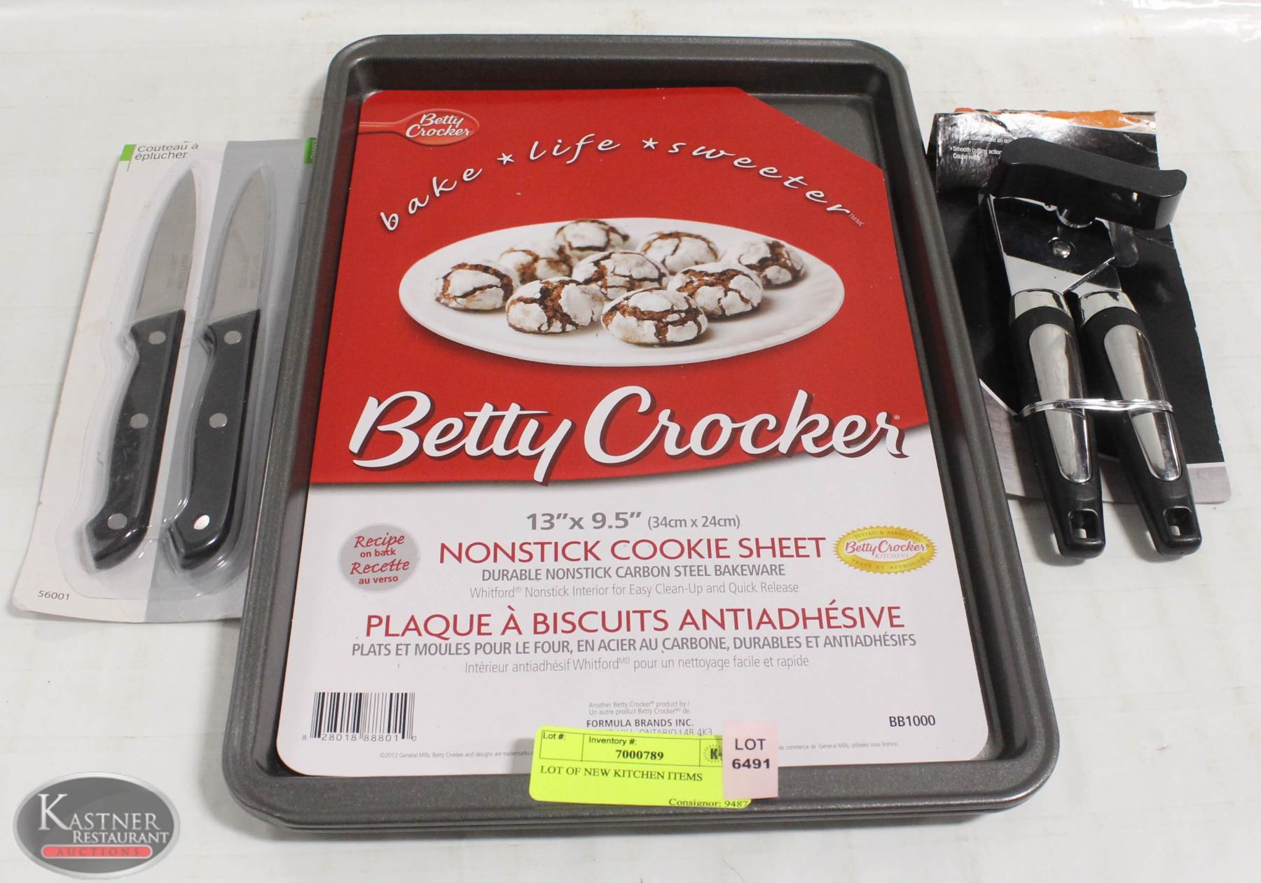 2 BAKING TRAYS, NEW UNOPENED 2 KNIVES, NEW CAN OPENER