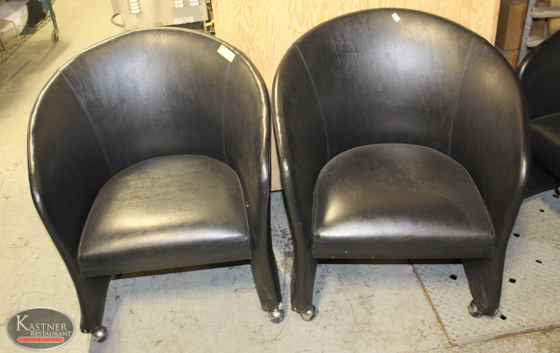 LOT OF TWO LEATHERETTE BUCKET CHAIRS ON CASTORS