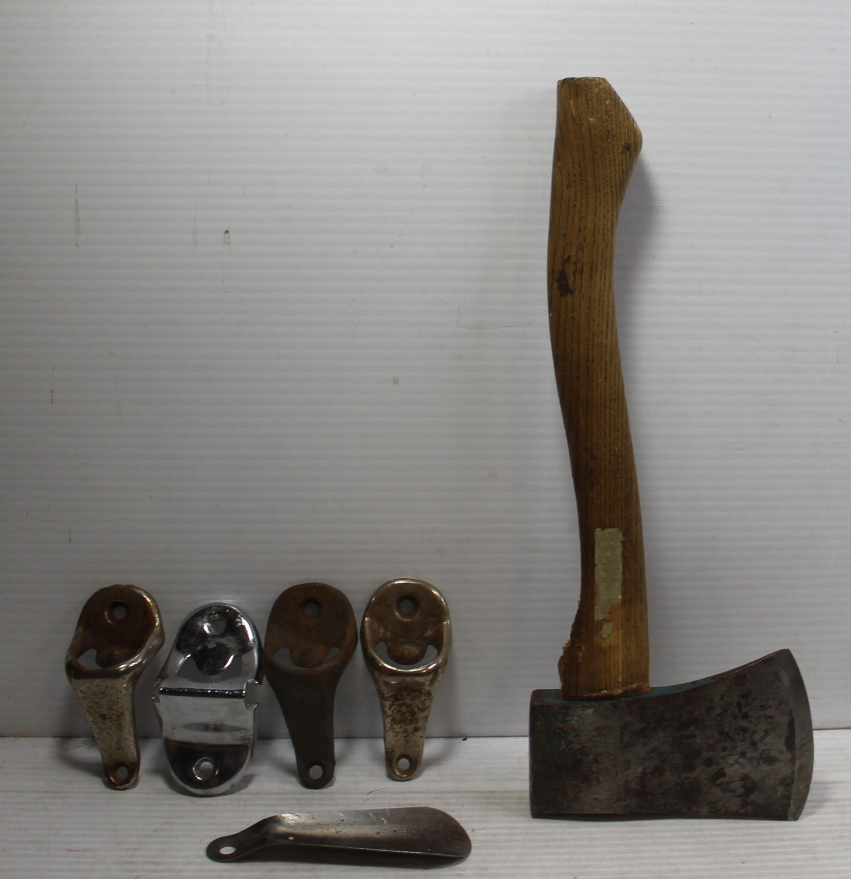 LOT W/ VINTAGE AXE + 4 BOTTLE OPENERS + SHOE HORN
