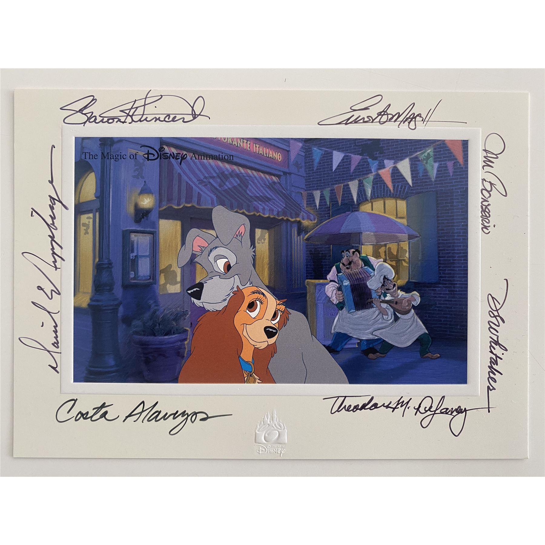 Lady and the Tramp Studio Romance Hand Painted Limited Edition plus signed 7 times by Disney Artists on postcard. Lady and the Tramp Disney/MGM Studios. 2000 limited edition animation cel. Studio Romance, the famous Belle Notte spaghetti scene, based on 1955 Disney feature film. Multi-signed autograph card by James Bonserio, Sharon Vincent, Theodora Delaney, Erin Magill, David Rippberger, David Whitaker, Costa Alavezos. Very rare.