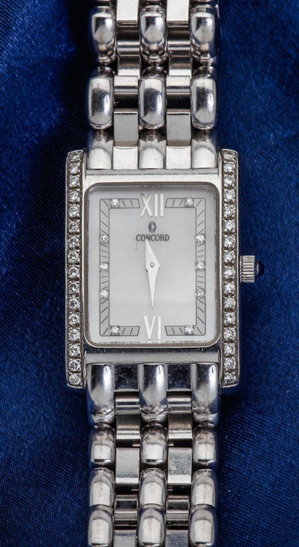 Lady's Concord, Diamond, 18k White Gold Wristwatch. Having a quartz movement, rectangular shaped case, enhanced by 32 round full-cut diamond, weighing a total of approximately .40 carat, white dial with Roman numeral & diamond markers, water resistant and completed by a link style 18k white gold bracelet, gross weight 64.00 grams.