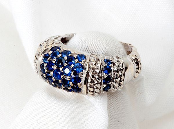 Lady's Sapphire, 18k White Gold Band Style Ring. Decorated by bead set sapphires and enhanced by row style bands, stamped Cassis on the inside of the band, gross weight 14.90 grams.