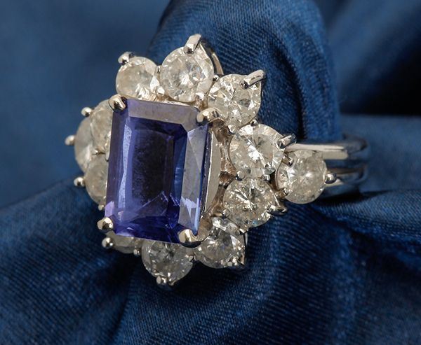 Lady's Tanzanite, Diamond, 14k White Gold Ring. Centering one emerald cut tanzanite, weighing approximately 4.00 carats, enhanced by 12 round brilliant-cut diamonds, weighing a total of approximately 3.00 carats, gross weight 11.60 grams, ring size 6 1/2.