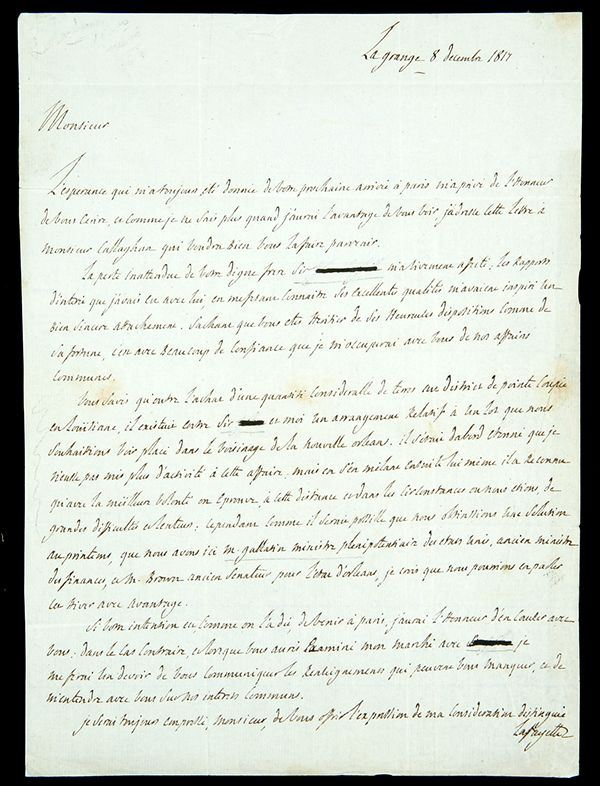 Lafayette, Marquis De. Autograph letter signed ("Lafayette") 1 page, 9� x 6� in., in French, La Grange (France), 8 Dec. 1817. To Vice-Admiral Sir Josiah Coghill, regarding the death of his brother (Sir John Coghill) and his claims to land in Louisiana. All references to Coghill were struck with ink at an early date. Fine; one short fold separation and one small prior mounting remnant on verso. Boldly penned and signed. Accompanied by a transcription and translation.