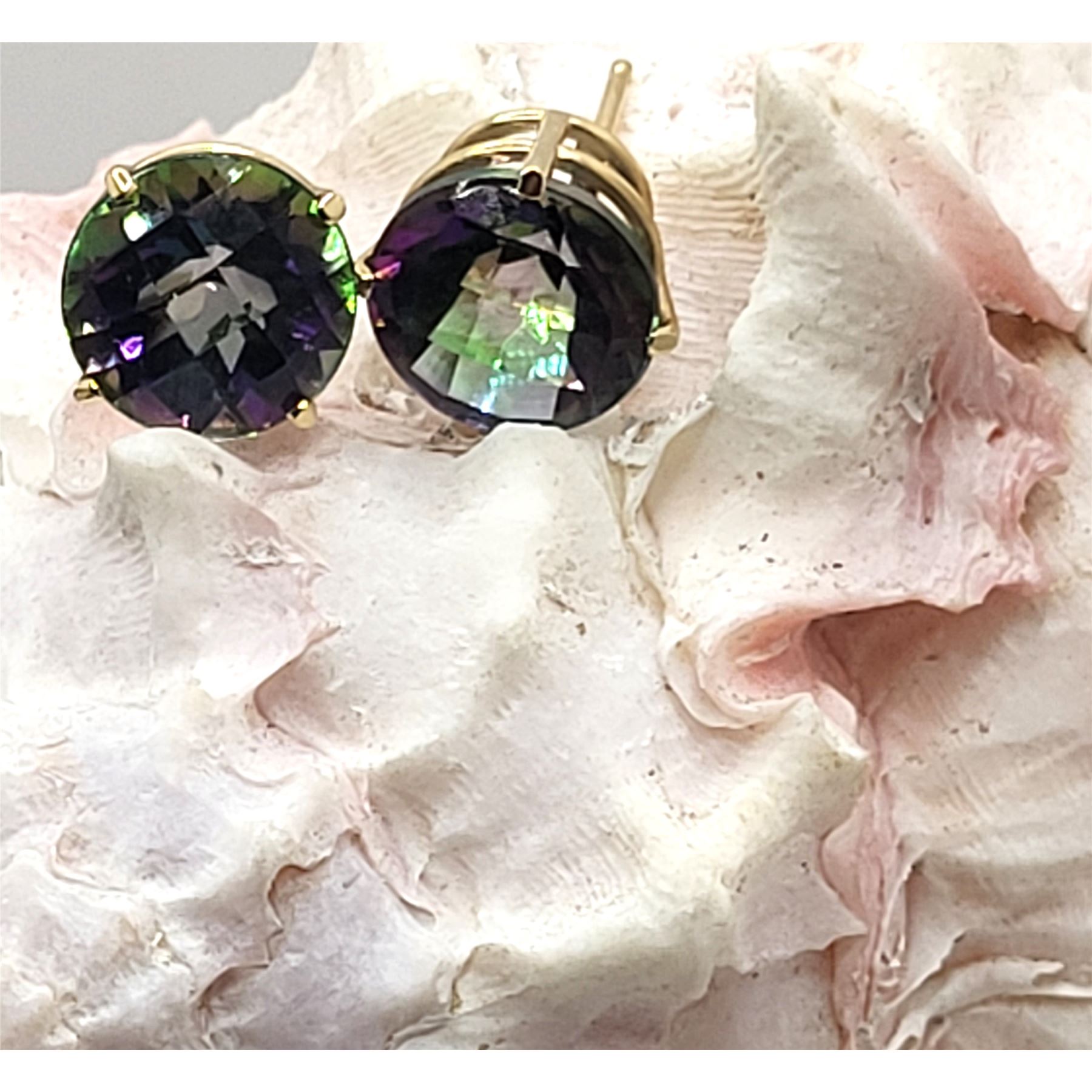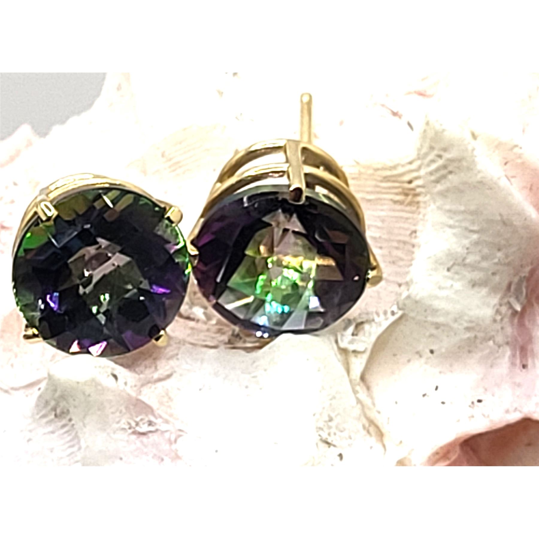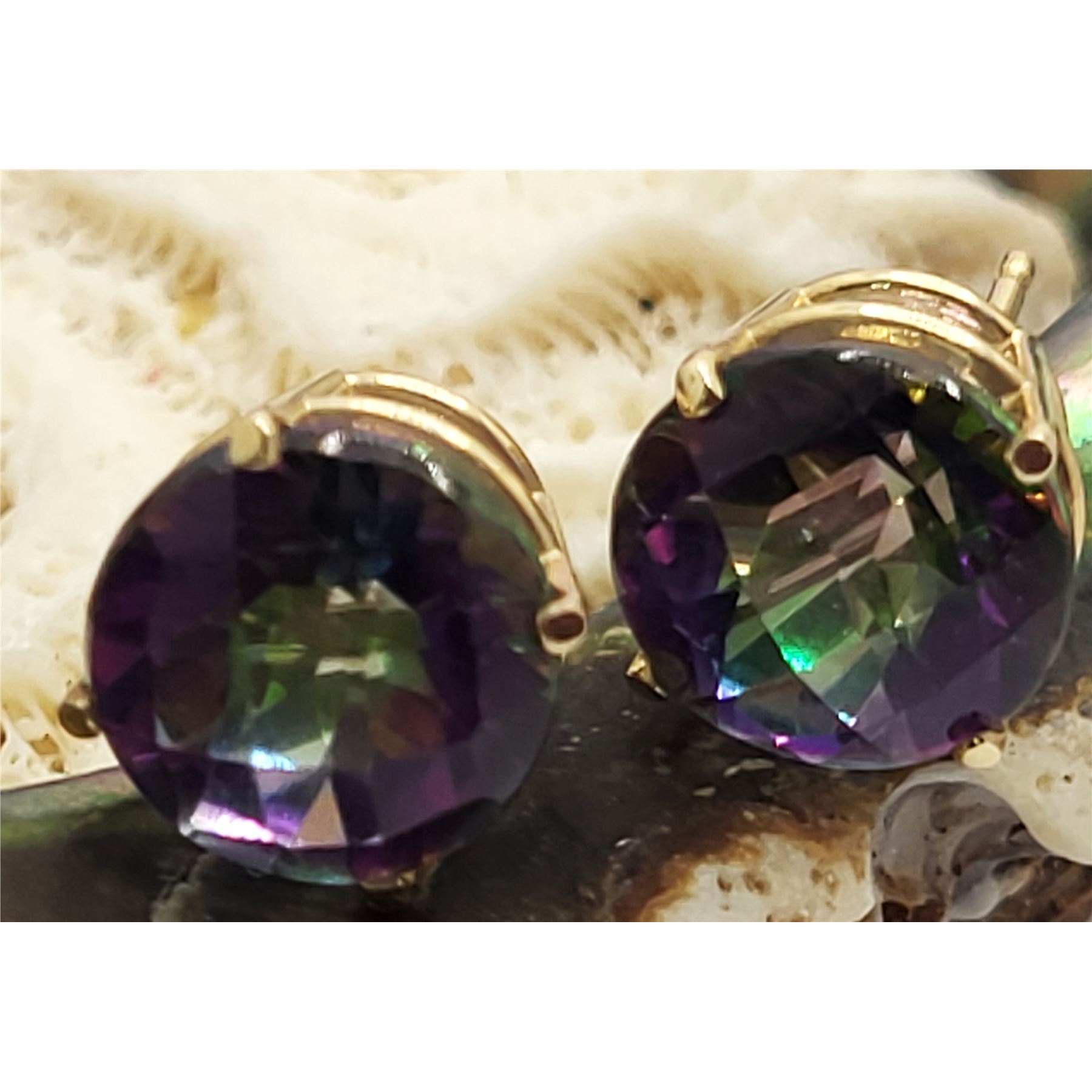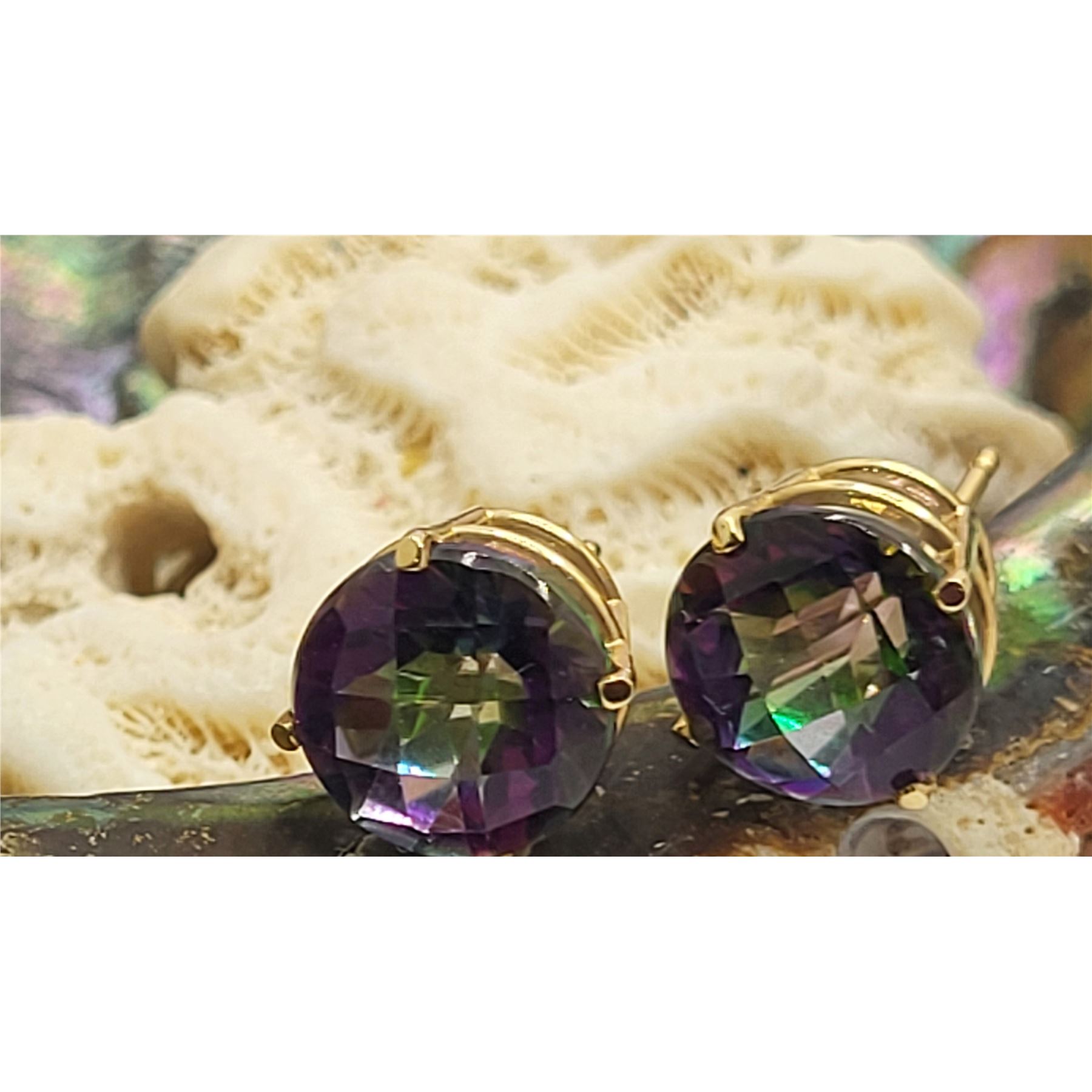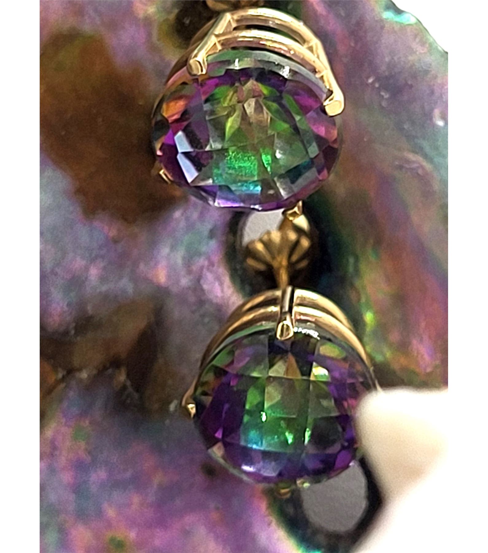 These 14 karat yellow gold earrings are delightful! Everyone is mesmerized by the deep tones of green and the flashes of violet and purple from the genuine topaz.& nbsp; The larger sized stones are harder to find, and they are top-faceted to get the most out of the sparkle!& nbsp; The earrings attach to the earlobes with posts and nice friction backs.& nbsp; Admin: 33199/24brh& nbsp; & lt;& lt;& lt;Did you know that mystic topaz is natural white topaz with a special application to the pavilion to give it such a magnificent color??& gt;& gt;