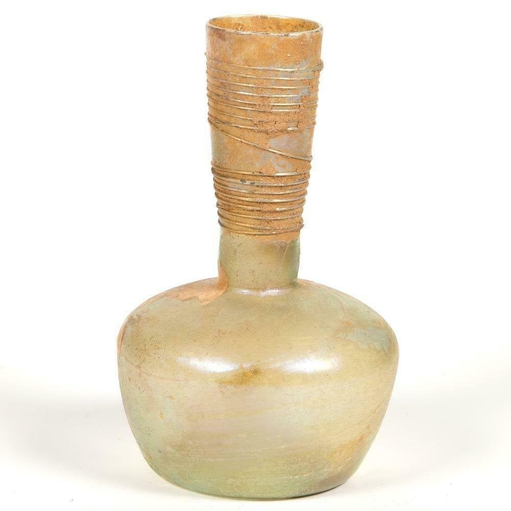Large Ancient Roman Glass Bottle c.1st-2nd century AD. Size 7 1/4 inches high. A large blown glass bottle with bulbous body and tall neck, with spiral glass threads. Provenance: Ex Joseph Saidian Collection to present owner by descent.