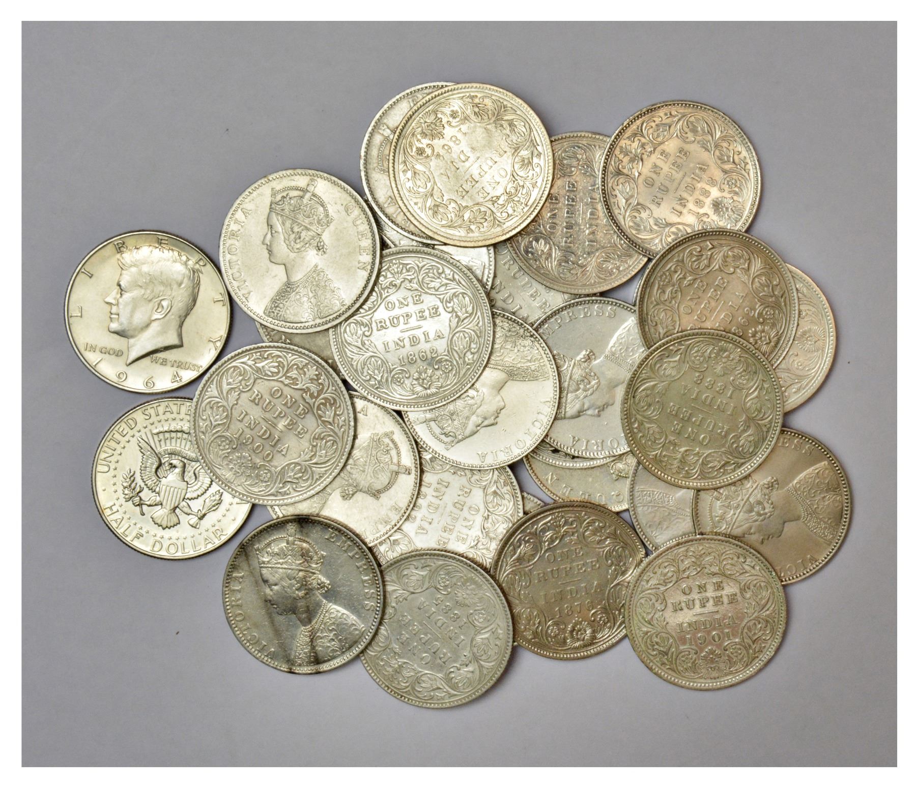 A group of 29 silver coins, 27x British India rupee includes dates 6x 1862, 1x 1874, 1x 1876, 1x 1879, 2x 1880, 1x 1884, 2x 1885, 2x 1888, 1x 1889, 1x 1890, 1x 1891, 2x 1892, 2x 1900, 4x 1901 and 2x United States of America, Half Dollar, 1964 and 1968. (29 coins)