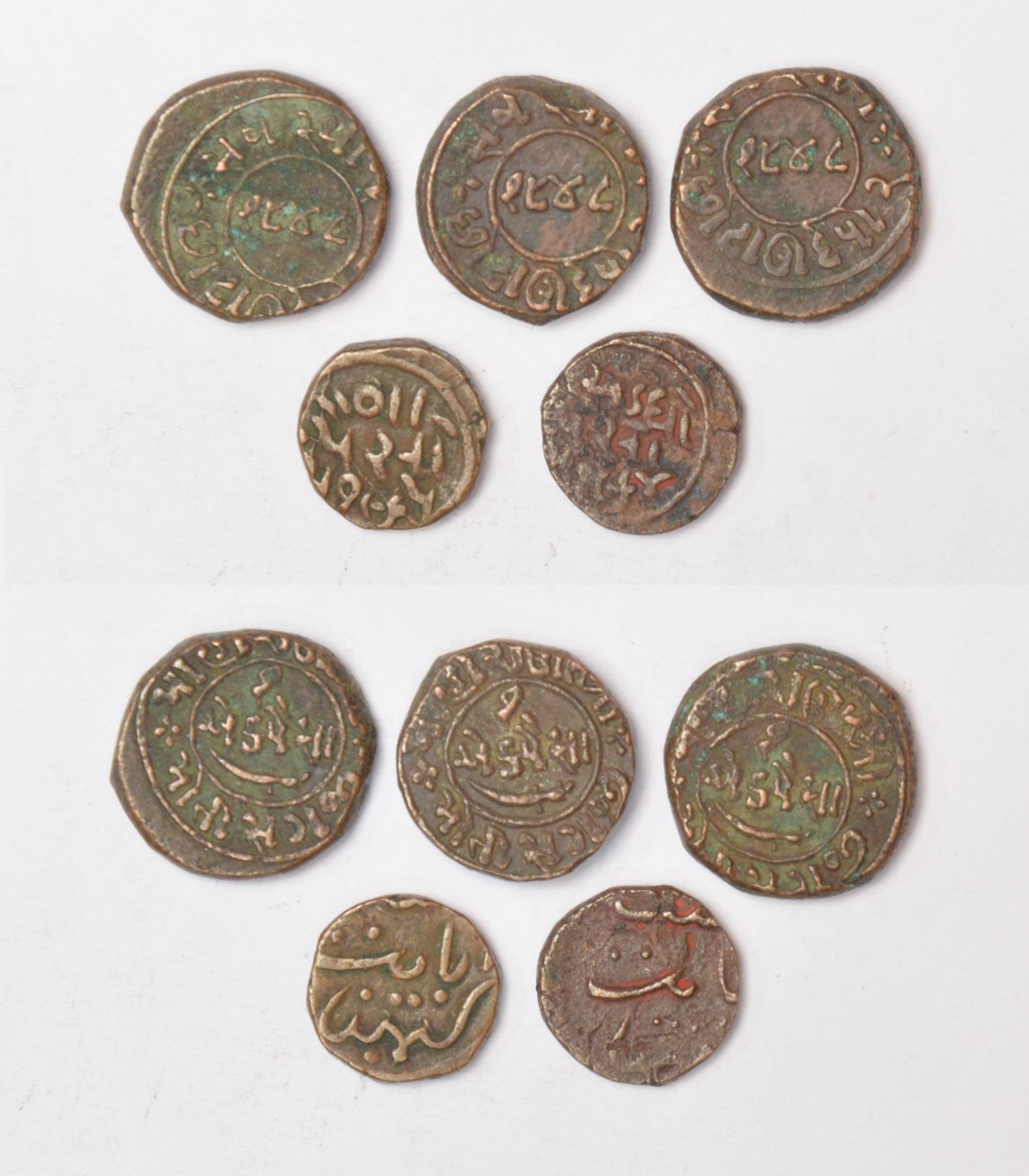 A group of 5 Princely states copper coins, includes 3x Chhota Udaipur paisa and 2x Cambay ½ paisa. (5 coins)