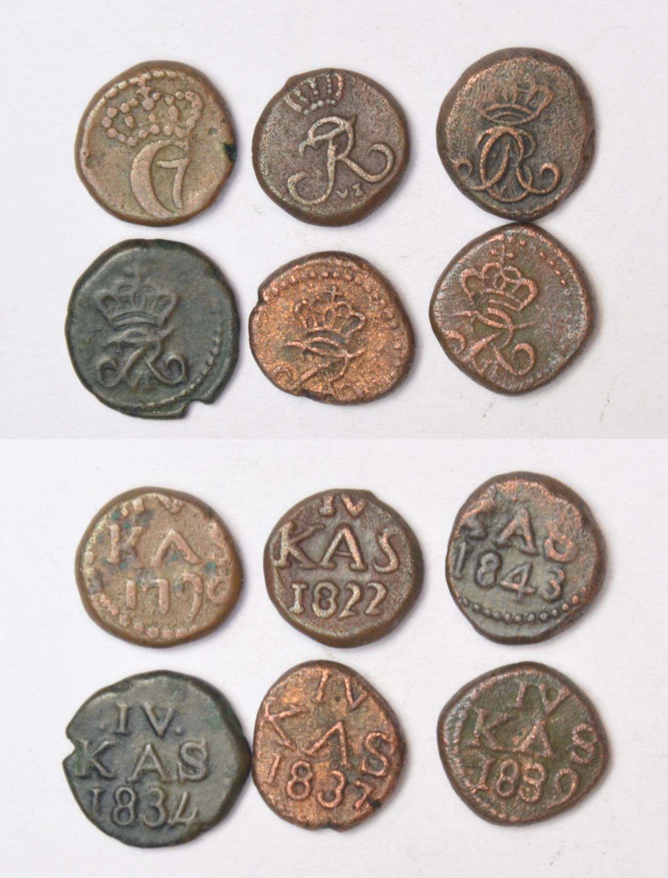 A group of 6 Indo-Danish copper 4 cash, includes 1x Christian VII, 4x Frederik and 1x Christian VIII, various dates and types. (6 coins)