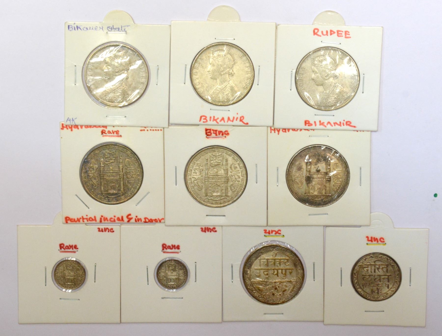 Large Lots: A group of 10 Princely states silver coins, includes 3x Bikaner, 5x Hyderabad and 2x Mewar-Udaipur, various denominations and types. (10 coins)