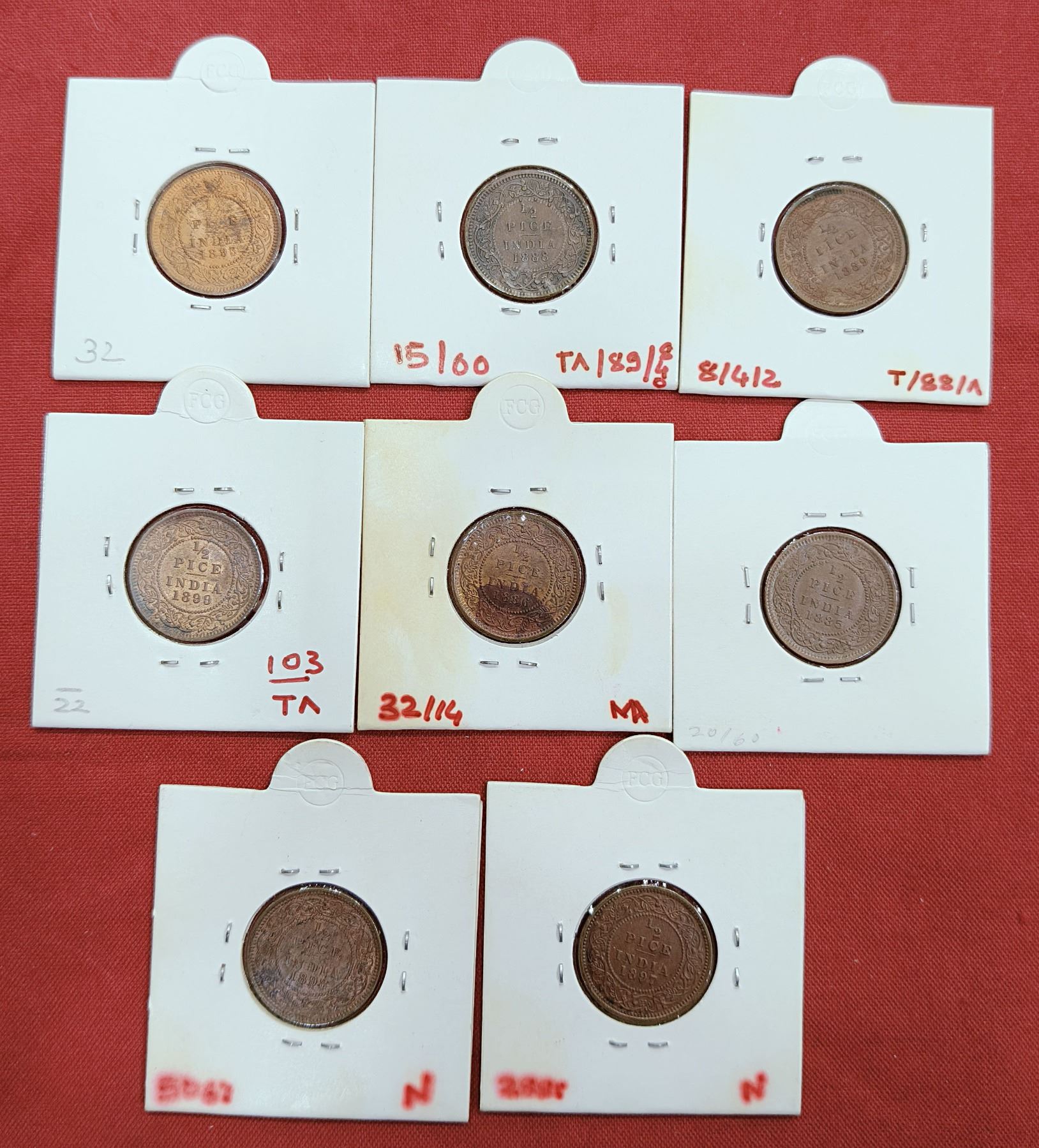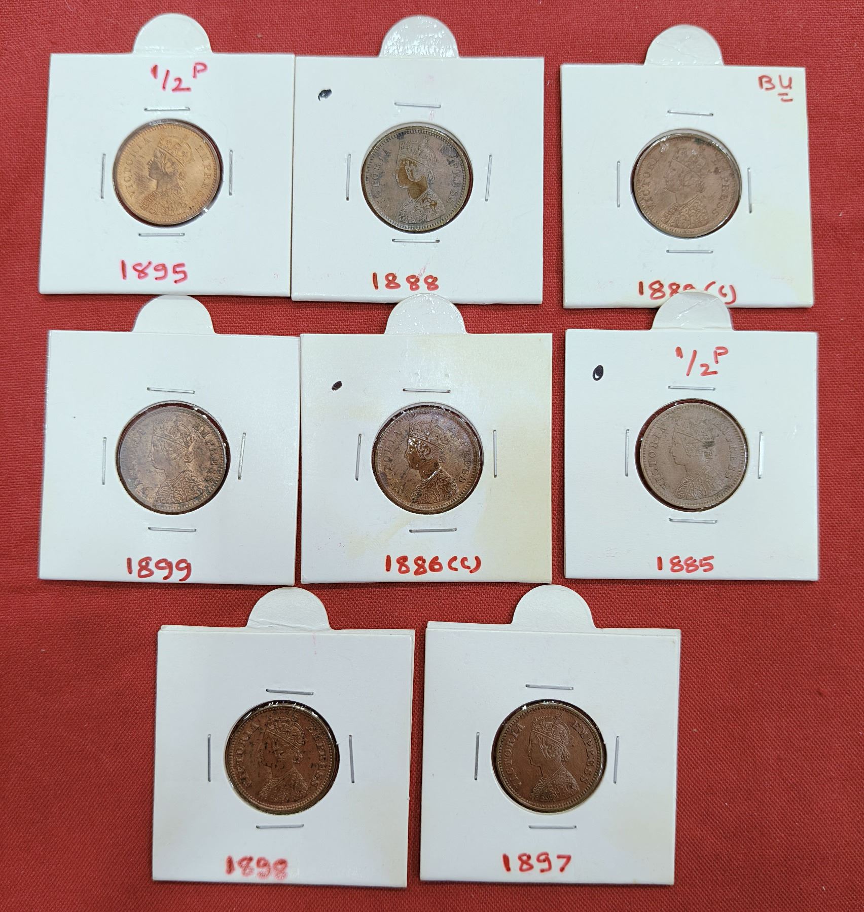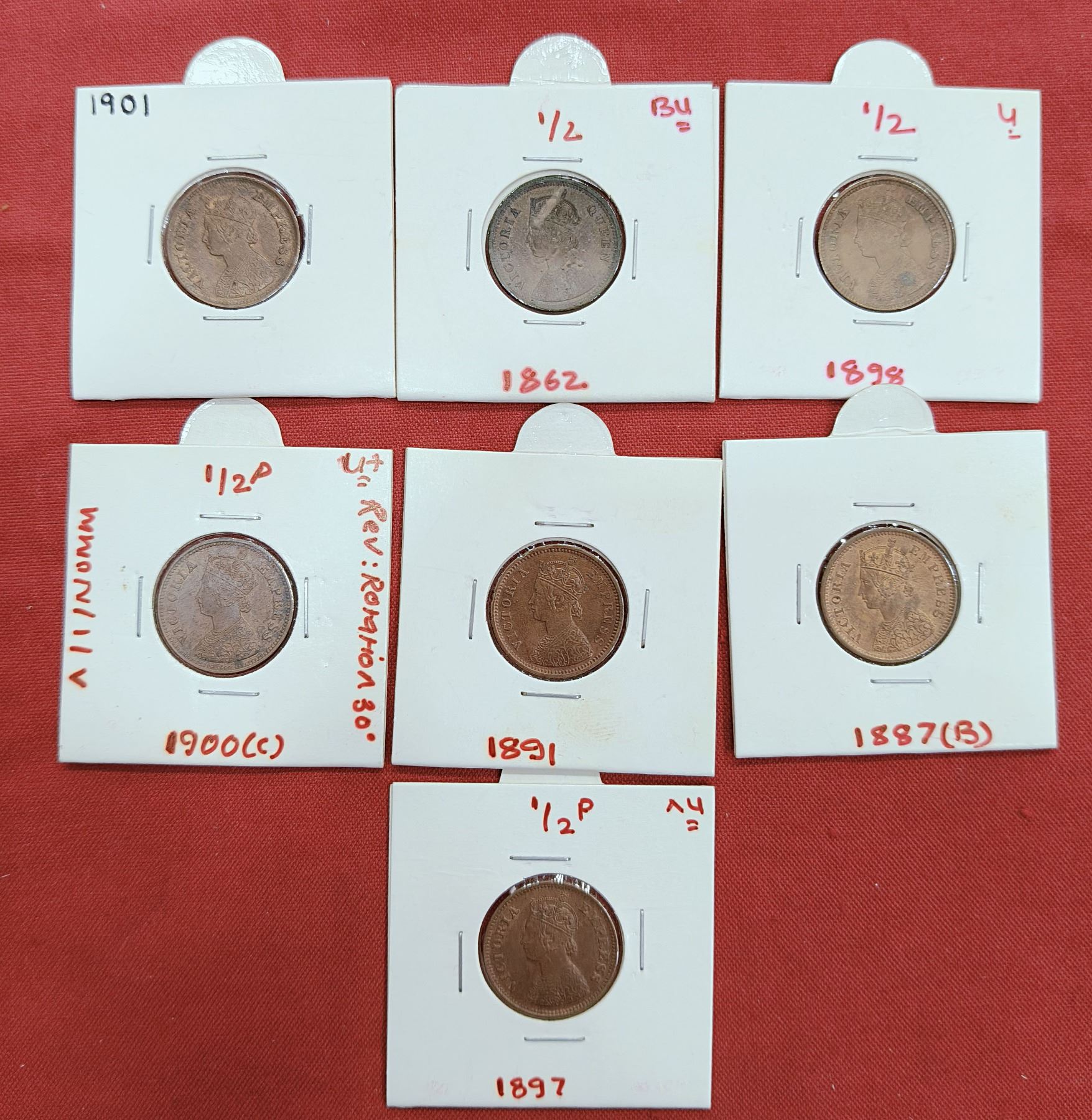 Large Lots: A group of 15 Victoria copper ½ pice, includes Queen and Empress, 1862, 1885, 1886, 1887, 1888, 1889, 1891, 1895, 1897 (2), 1898 (2), 1899, 1900 and 1901, Calcutta mint. (15 coins)