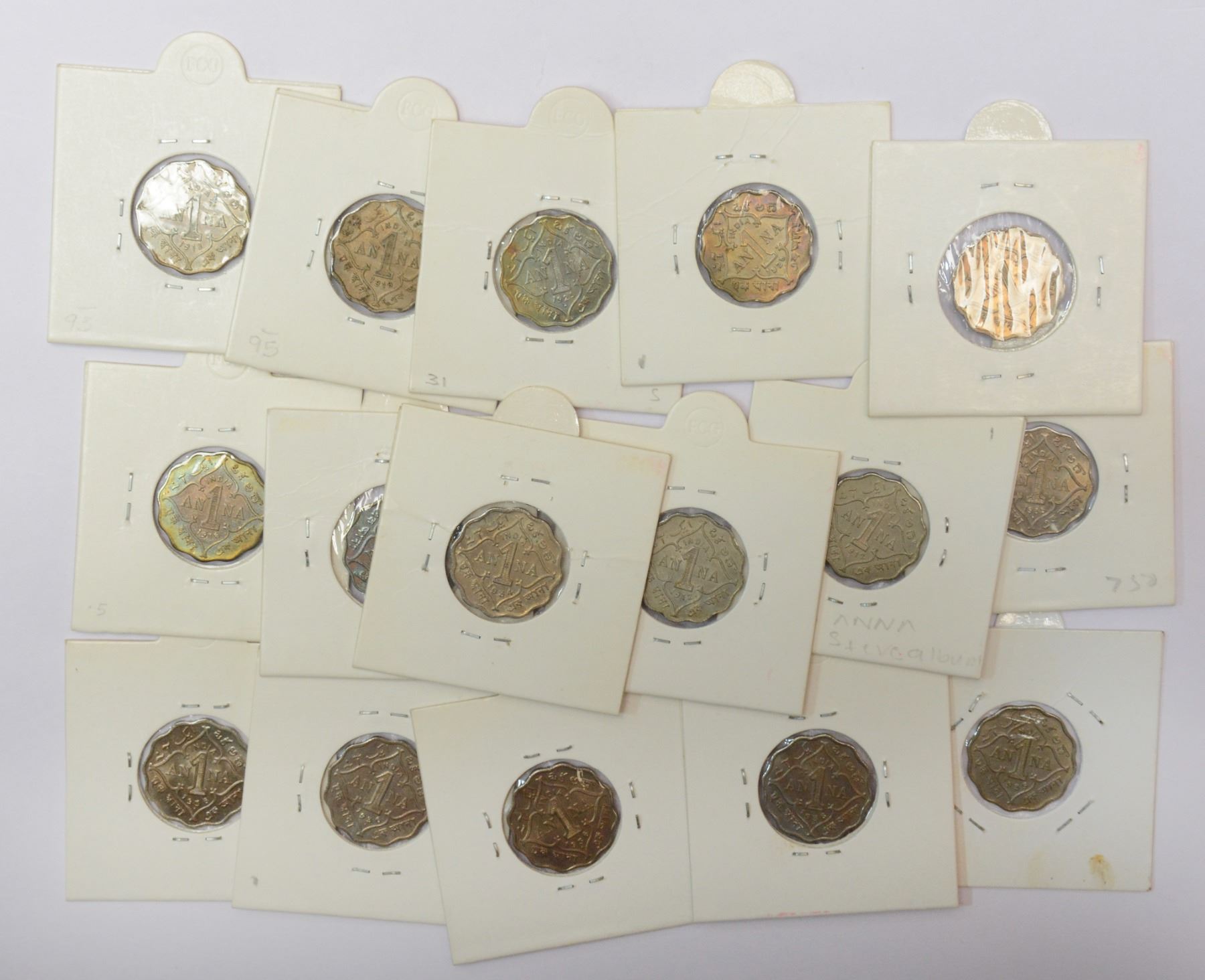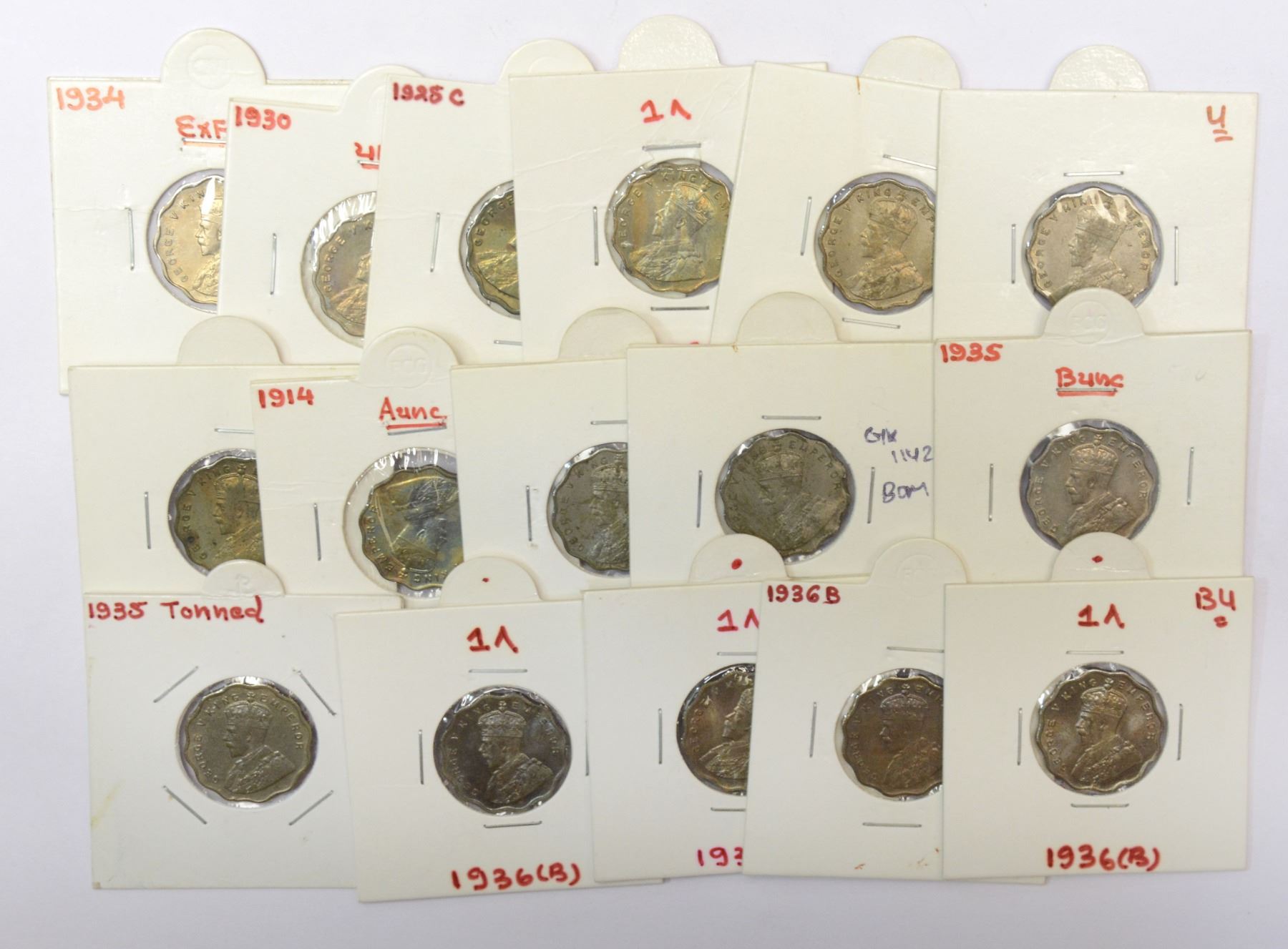 Large Lots: A group of 16 George V cupro-nickel 1 anna, includes 1912 (2), 1914, 1916, 1918 (2), 1923, 1925, 1930, 1934, 1935 (2) and 1936 (4), 12x Bombay and 4x Calcutta mint. Many coins are in high grade. (16 coins)