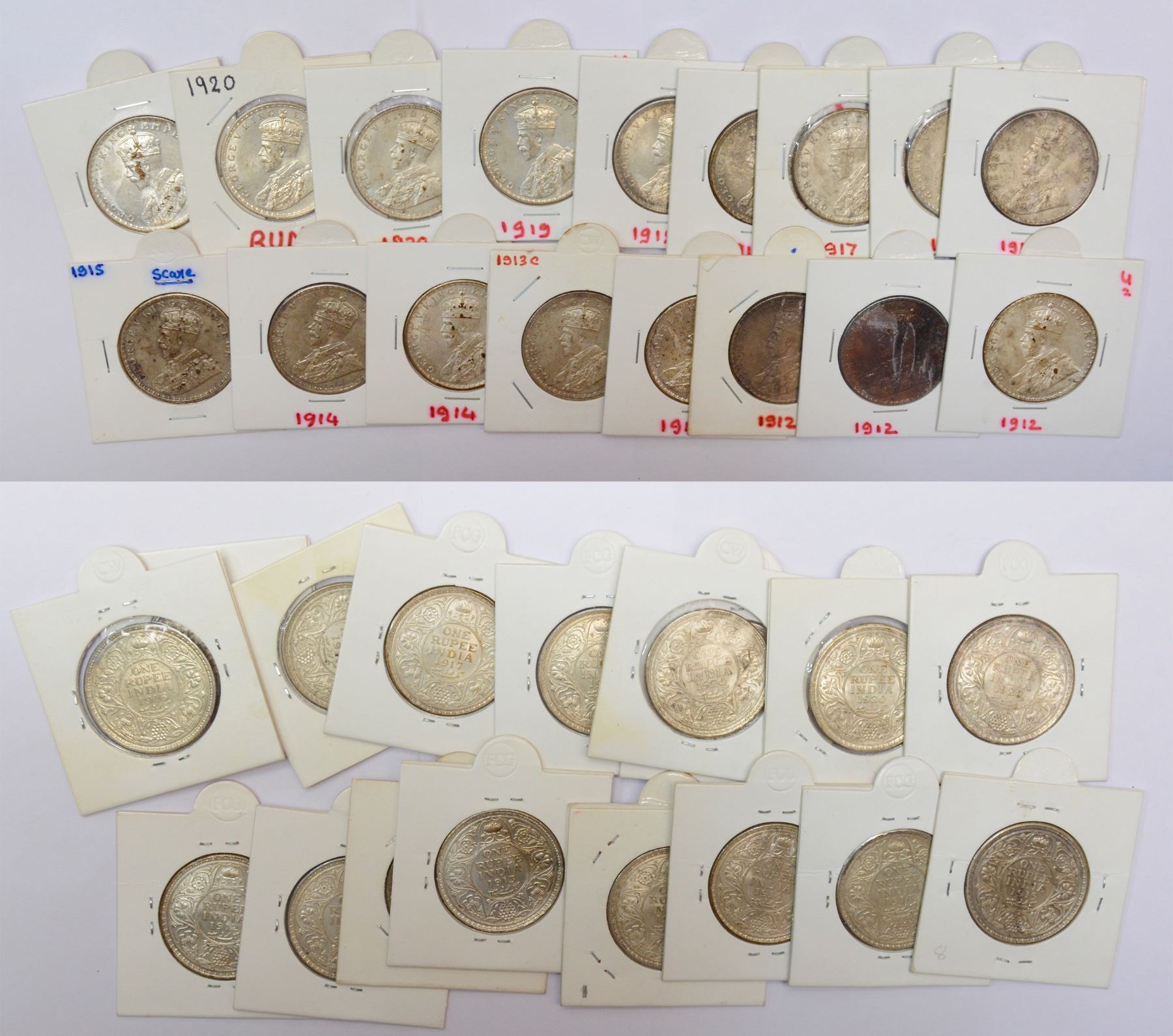Large Lots: A group of 17 George V silver rupee, includes 1912 (3), 1913 (2), 1914 (2), 1915, 1916 (2), 1917 (2), 1918, 1919 and 1920 (3), 14x Bombay and 3x Calcutta mint. (17 coins)