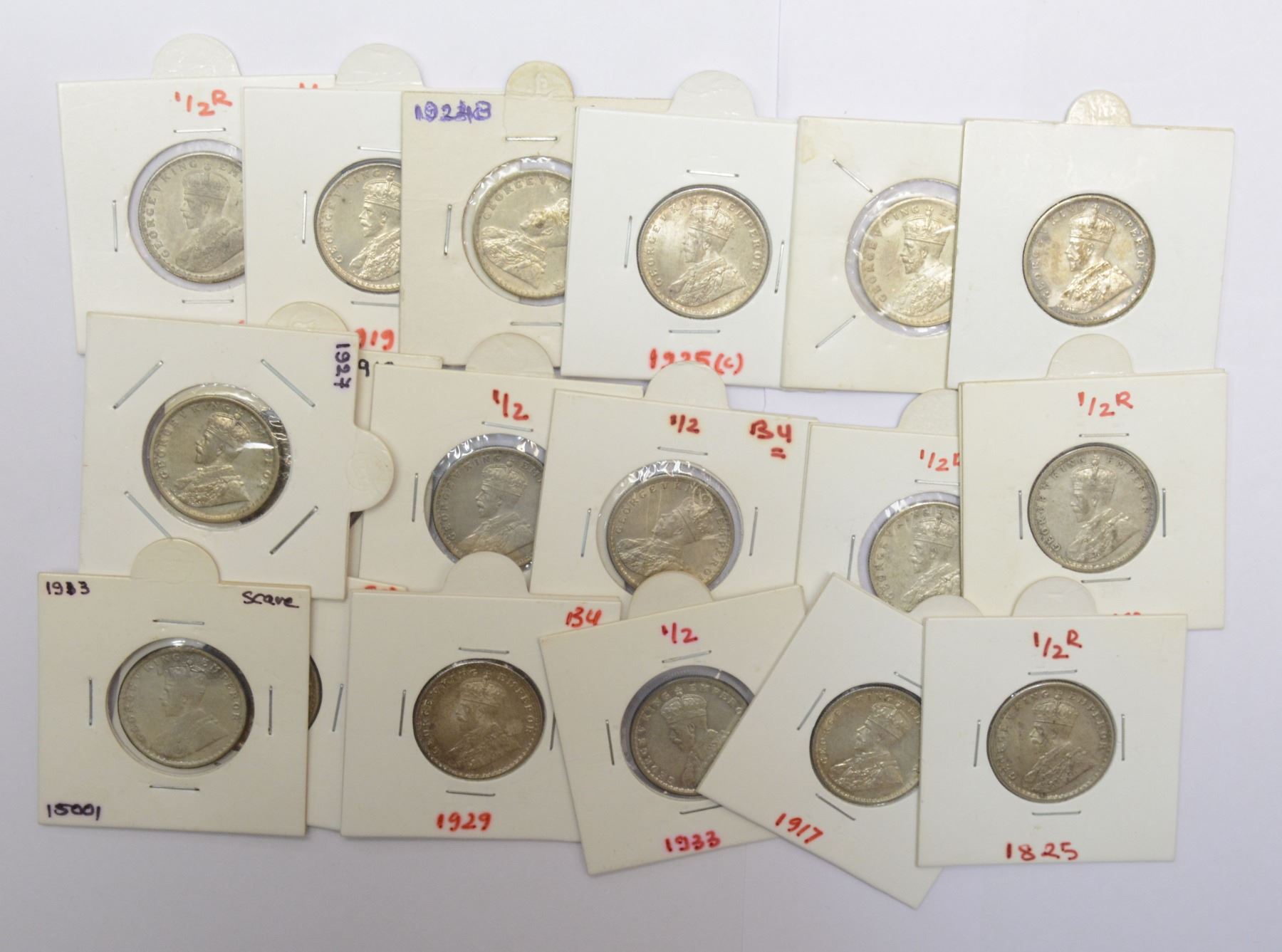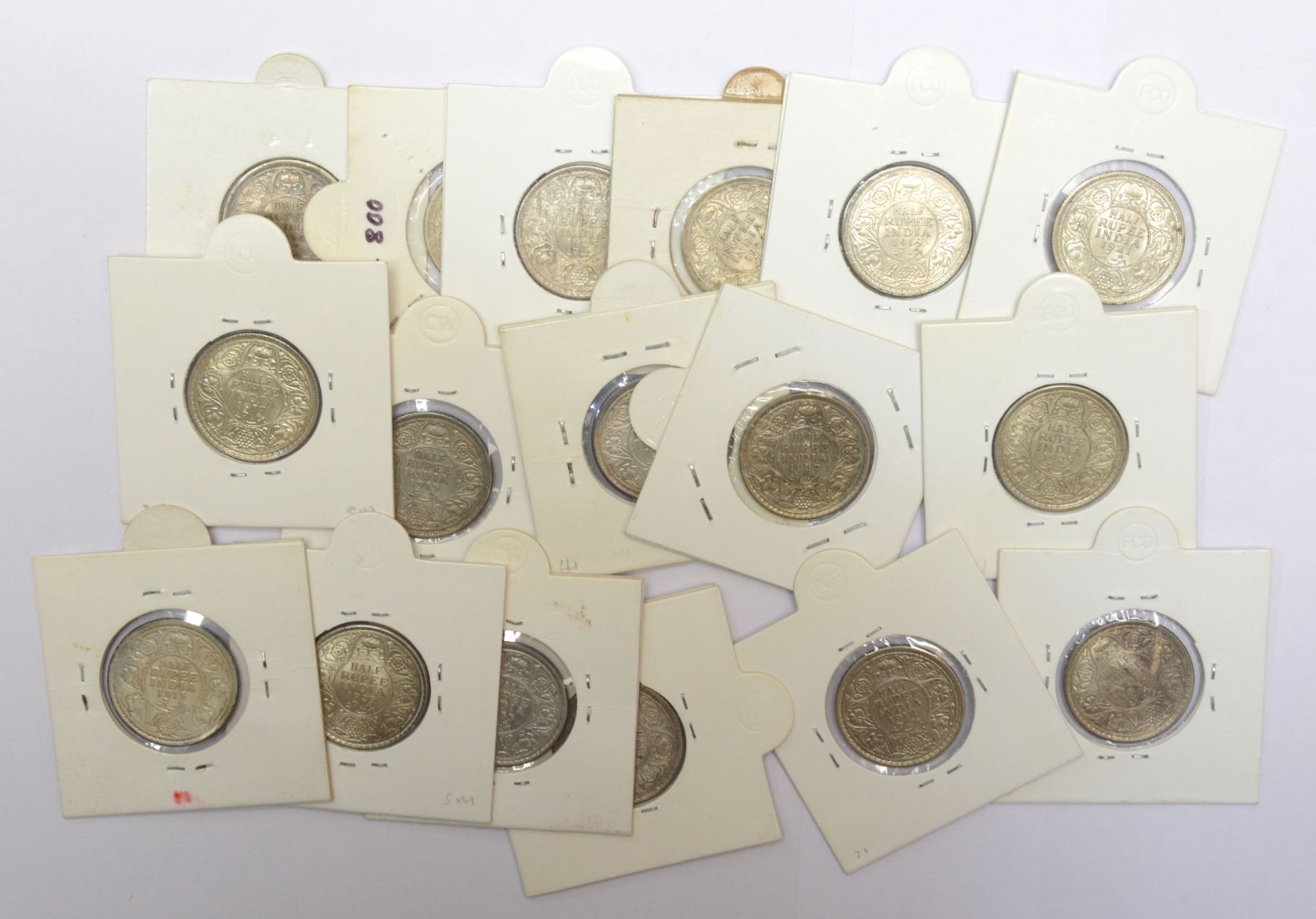 Large Lots: A group of 19 George V silver ½ rupee, includes 1912, 1913 (2), 1914, 1915, 1917 (2), 1918, 1919, 1921, 1923, 1924, 1925 (2), 1927, 1929, 1933 and 1934 (2), 6x Bombay and 13x Calcutta mint. (19 coins)
