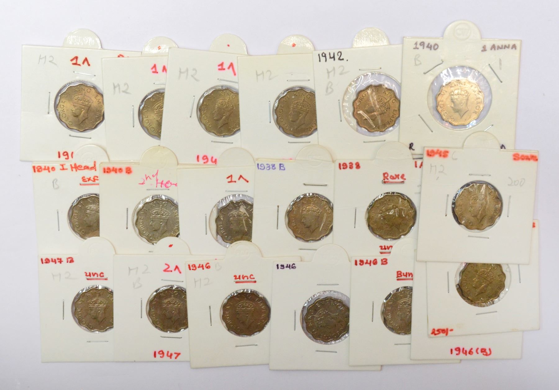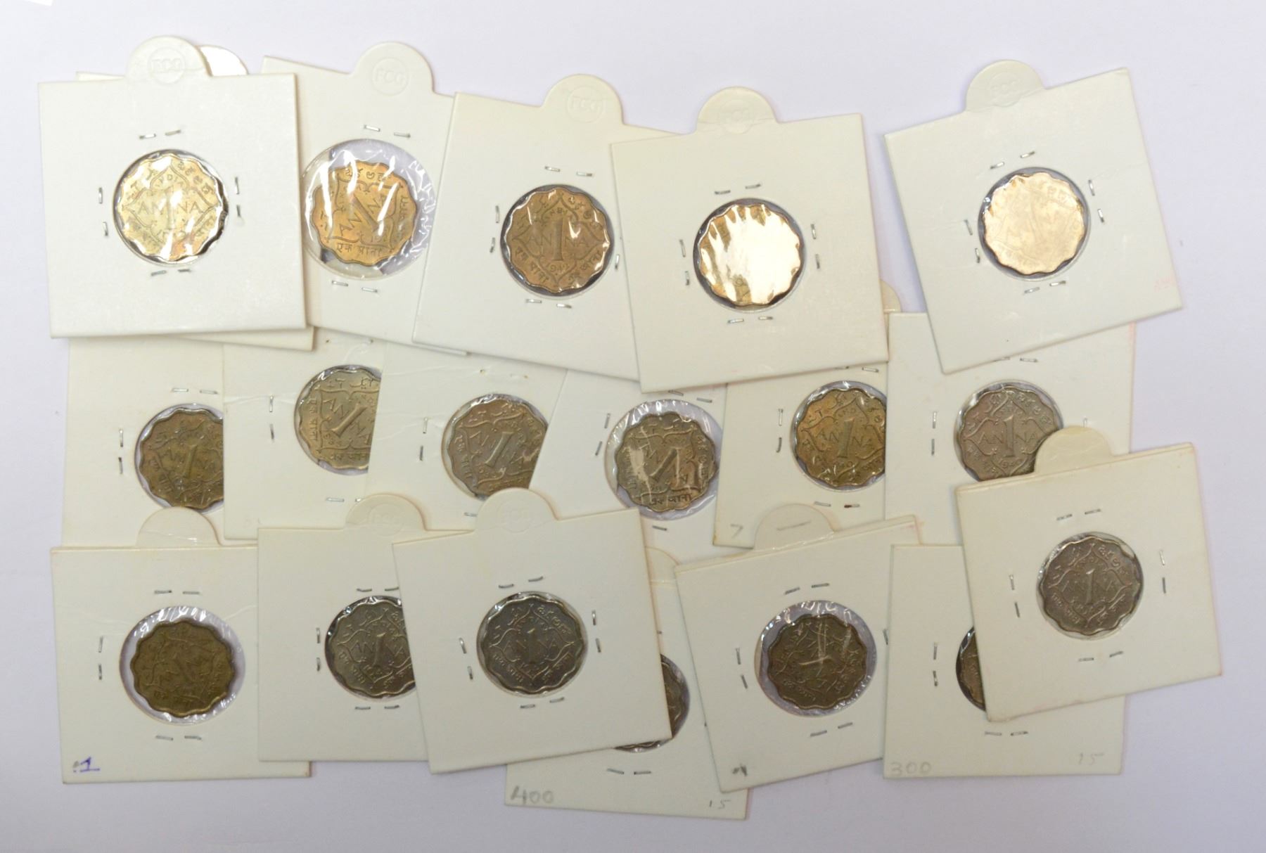Large Lots: A group of 19 George VI cupro-nickel and nickel brass 1 anna, includes 1938 (2), 1939, 1940 (3), 1942 (2), 1943 (3), 1945 (2), 1946 (4) and 1947 (2), 12x Bombay and 7x Calcutta mint. (19 coins)