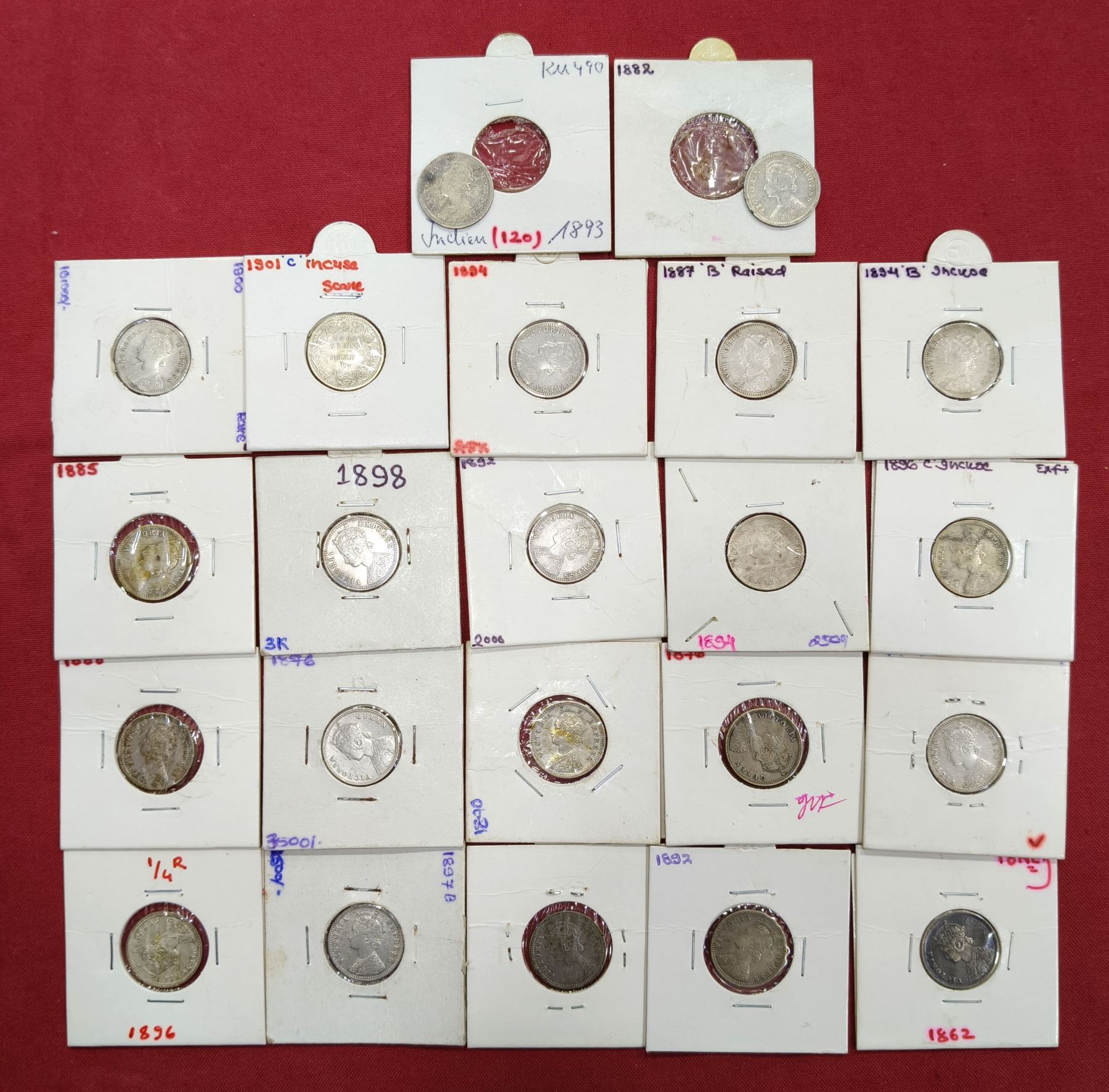 Large Lots: A group of 22 Victoria silver ¼ rupee, includes Queen and Empress, 1862, 1876 (2), 1882, 1885, 1887, 1888, 1890, 1891, 1892 (2), 1893, 1894 (3), 1896 (2), 1897 (2), 1898, 1900 and 1901, Bombay and Calcutta mints, various types. (22 coins)