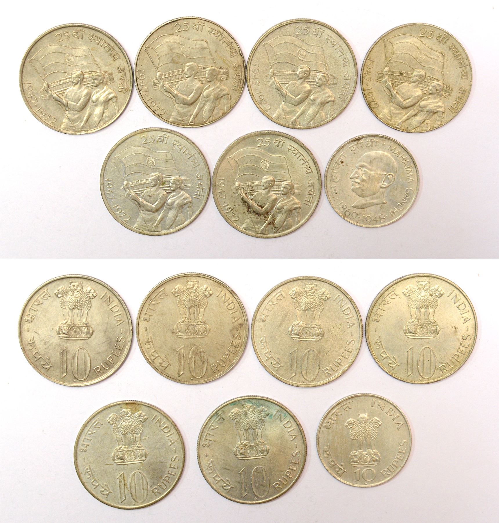 Large Lots: A group of 7 Republic of India silver 10 rupees, 1x 1969, Mahatma Gandhi and 6x 1972, 25th Anniversary of Independence. (7 coins)