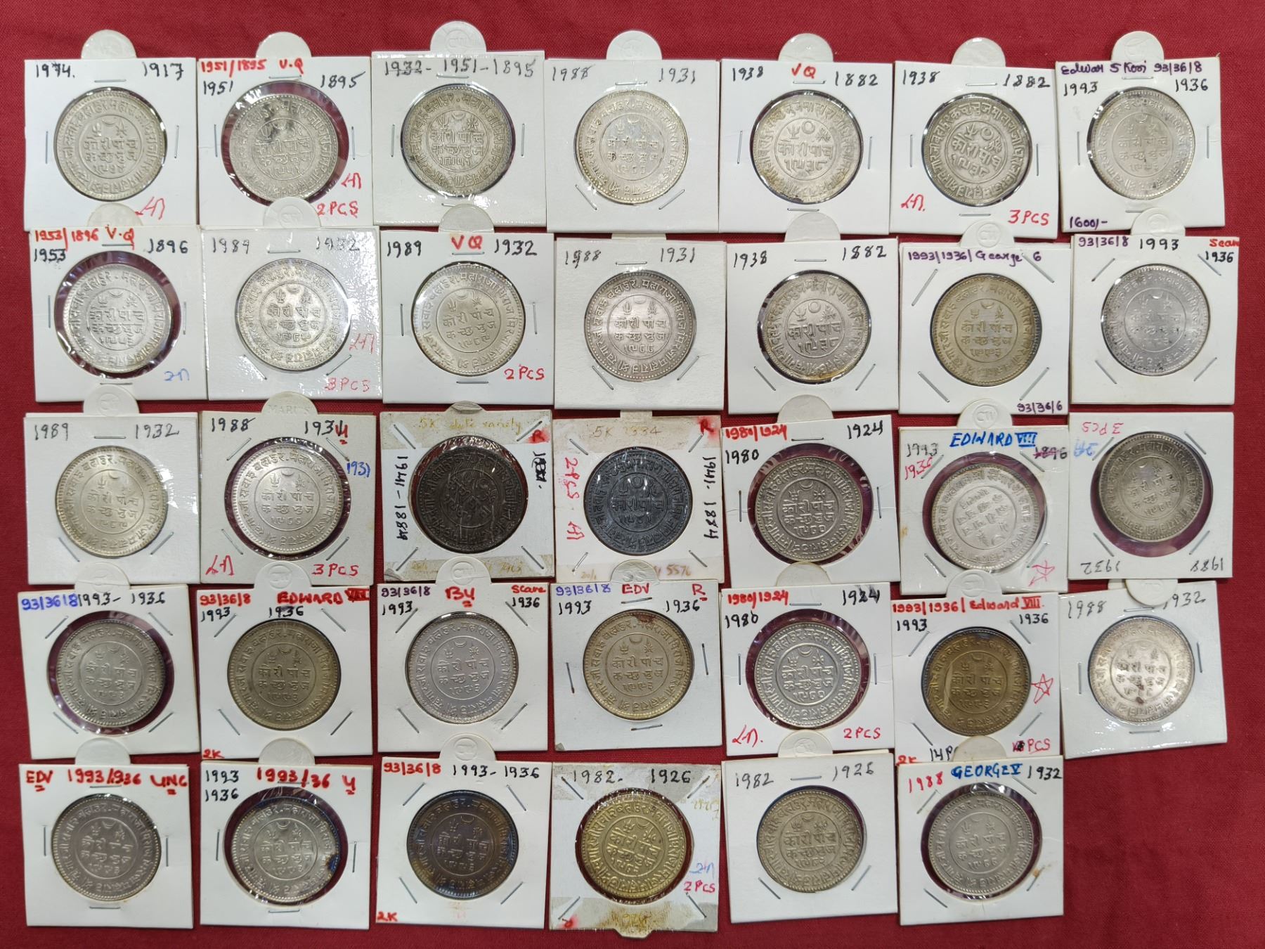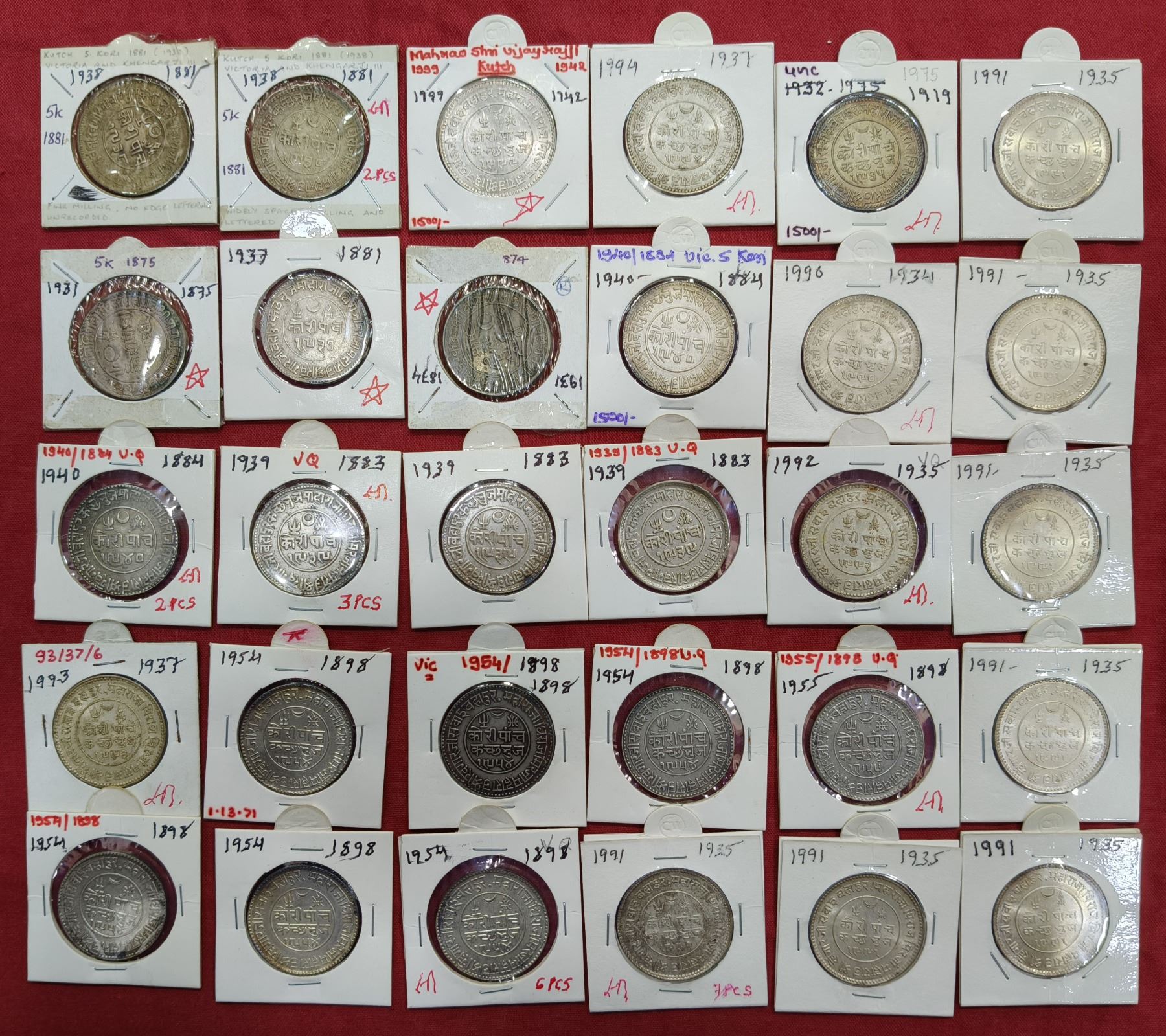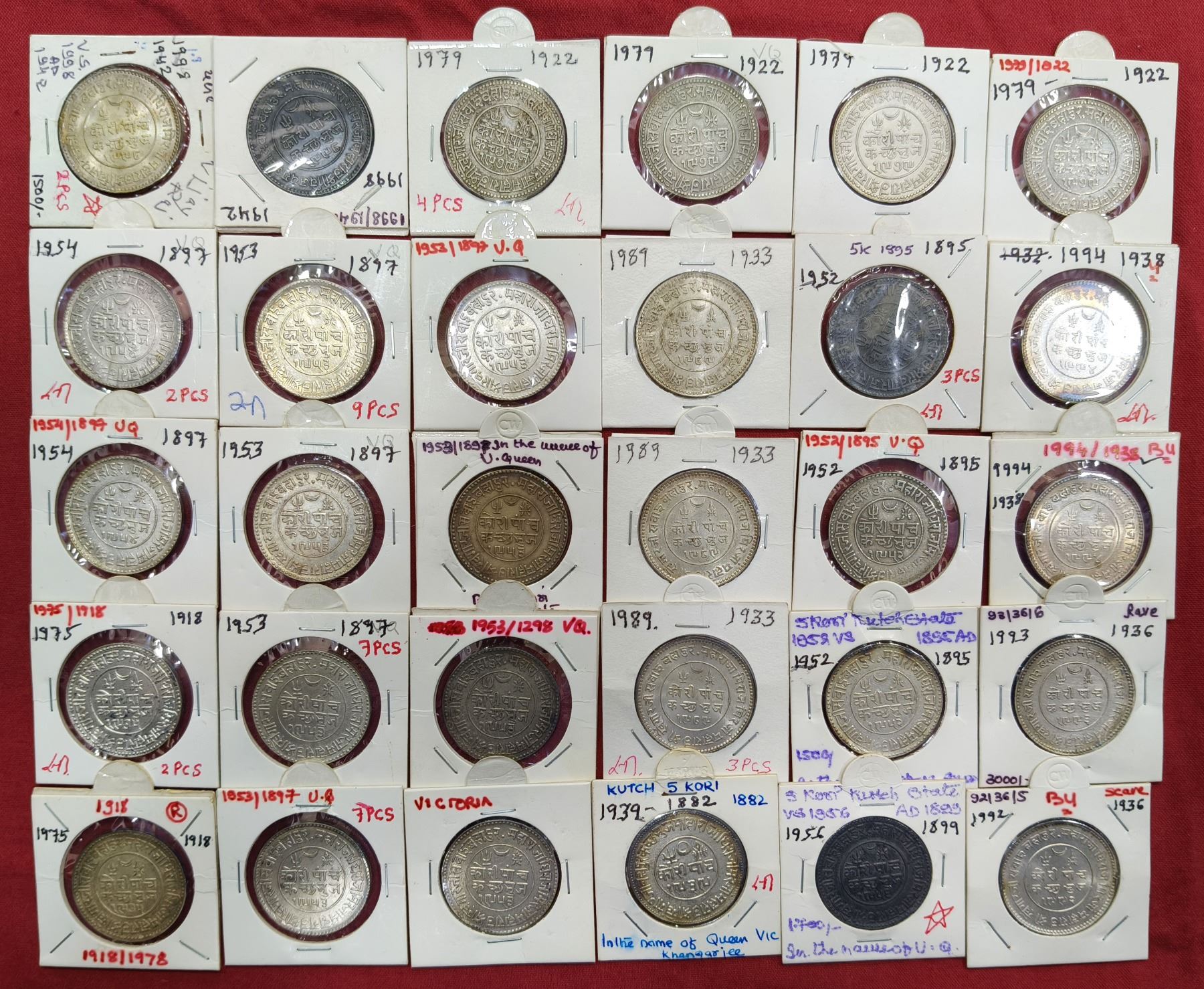 Large Lots: A group of 94 Kutch state silver 5 koris, includes (a) Pragmalji II, 1x VS 1931/AD 1874 and 1x VS 1931/AD 1875; (b) Khengarji III, 1x VS 1937/AD 1881; 2x VS 1938/AD 1881; 3x VS 1938/AD 1882; 1x VS 1939/AD 1882; 3x VS 1939/AD 1883; 2x VS 1940/AD 1884; 2x VS 1941/AD 1884; 2x VS 1951/AD 1895; 3x VS 1952/AD 1895; 1x VS 1953/AD 1896; 8x VS 1953/AD 1897; 2x VS 1954/AD 1897; 6x VS 1954/AD 1898; 1x VS 1955/AD 1898; 1x VS 1956/AD 1899; 1x VS 1974/AD 1917; 2x VS 1975/AD 1918; 1x VS 1975/AD 1919; 4x VS 1979/AD 1922; 2x VS 1980/AD 1924; 2x VS 1982/AD 1926; 3x VS 1988/AD 1931; 3x VS 1988/AD 1932; 3x VS 1989/AD 1932; 1x VS 1990/AD 1934; 7x VS 1991/AD 1935; 1x VS 1992/AD 1935; 1x VS 1992/AD 1936; 13x VS 1993/AD 1936; 1x VS 1993/AD 1937; 1x VS 1994/AD 1937; 2x VS 1994/AD 1938; 2x VS 1998/AD 1942; 1x VS 1999/AD 1942 and 3x VS 1989/AD 1933. (94 coins)
