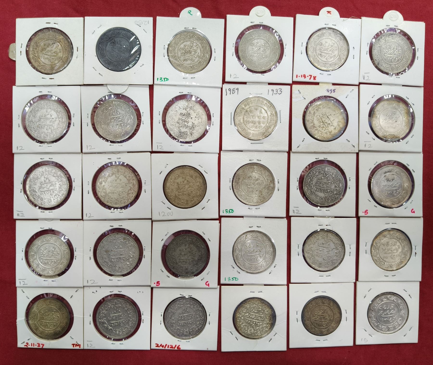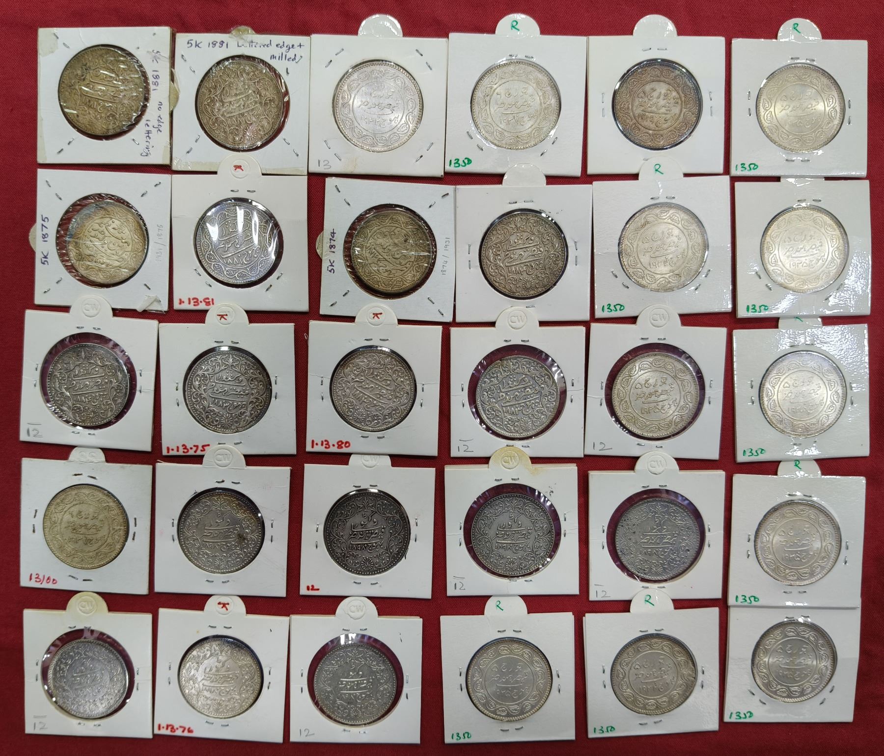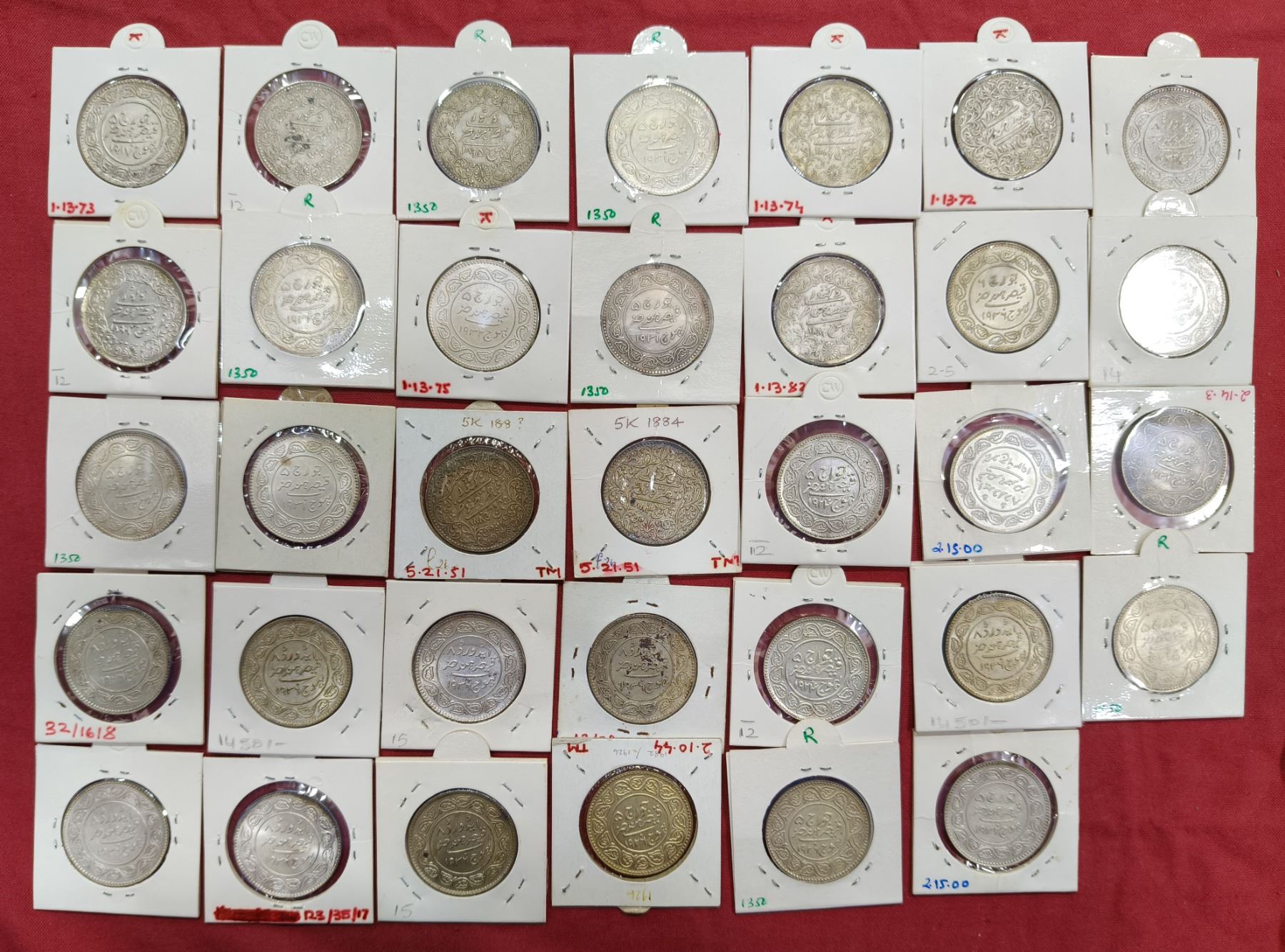 Large Lots: A group of 94 Kutch state silver 5 koris, includes (a) Pragmalji II, 1x VS 1931/AD 1874 and 1x VS 1931/AD 1875; (b) Khengarji III, 1x VS 1937/AD 1881; 2x VS 1938/AD 1881; 3x VS 1938/AD 1882; 1x VS 1939/AD 1882; 3x VS 1939/AD 1883; 2x VS 1940/AD 1884; 2x VS 1941/AD 1884; 2x VS 1951/AD 1895; 3x VS 1952/AD 1895; 1x VS 1953/AD 1896; 8x VS 1953/AD 1897; 2x VS 1954/AD 1897; 6x VS 1954/AD 1898; 1x VS 1955/AD 1898; 1x VS 1956/AD 1899; 1x VS 1974/AD 1917; 2x VS 1975/AD 1918; 1x VS 1975/AD 1919; 4x VS 1979/AD 1922; 2x VS 1980/AD 1924; 2x VS 1982/AD 1926; 3x VS 1988/AD 1931; 3x VS 1988/AD 1932; 3x VS 1989/AD 1932; 1x VS 1990/AD 1934; 7x VS 1991/AD 1935; 1x VS 1992/AD 1935; 1x VS 1992/AD 1936; 13x VS 1993/AD 1936; 1x VS 1993/AD 1937; 1x VS 1994/AD 1937; 2x VS 1994/AD 1938; 2x VS 1998/AD 1942; 1x VS 1999/AD 1942 and 3x VS 1989/AD 1933. (94 coins)