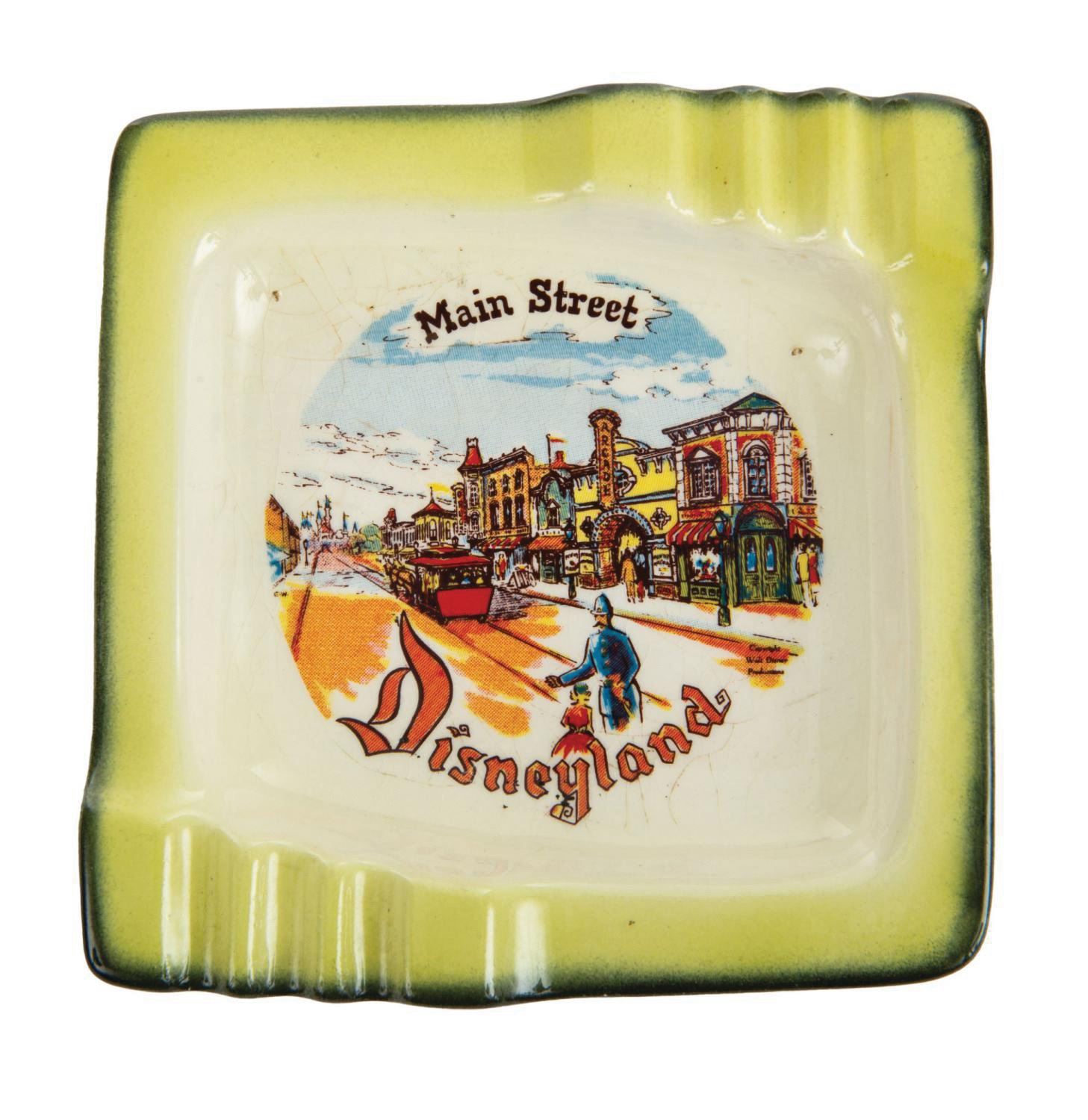 (Disneyland, 1955) A large souvenir ashtray manufactured by Eleanor Welborn. The East side of Main Street, with its horse-drawn streetcar and constable are beautifully represented within this early souvenir of Disneyland. The glazed ceramic ashtray measures 6.25"x6.25" and is in very good condition with minor crazing throughout, and a small .5" area of ceramic loss under base.