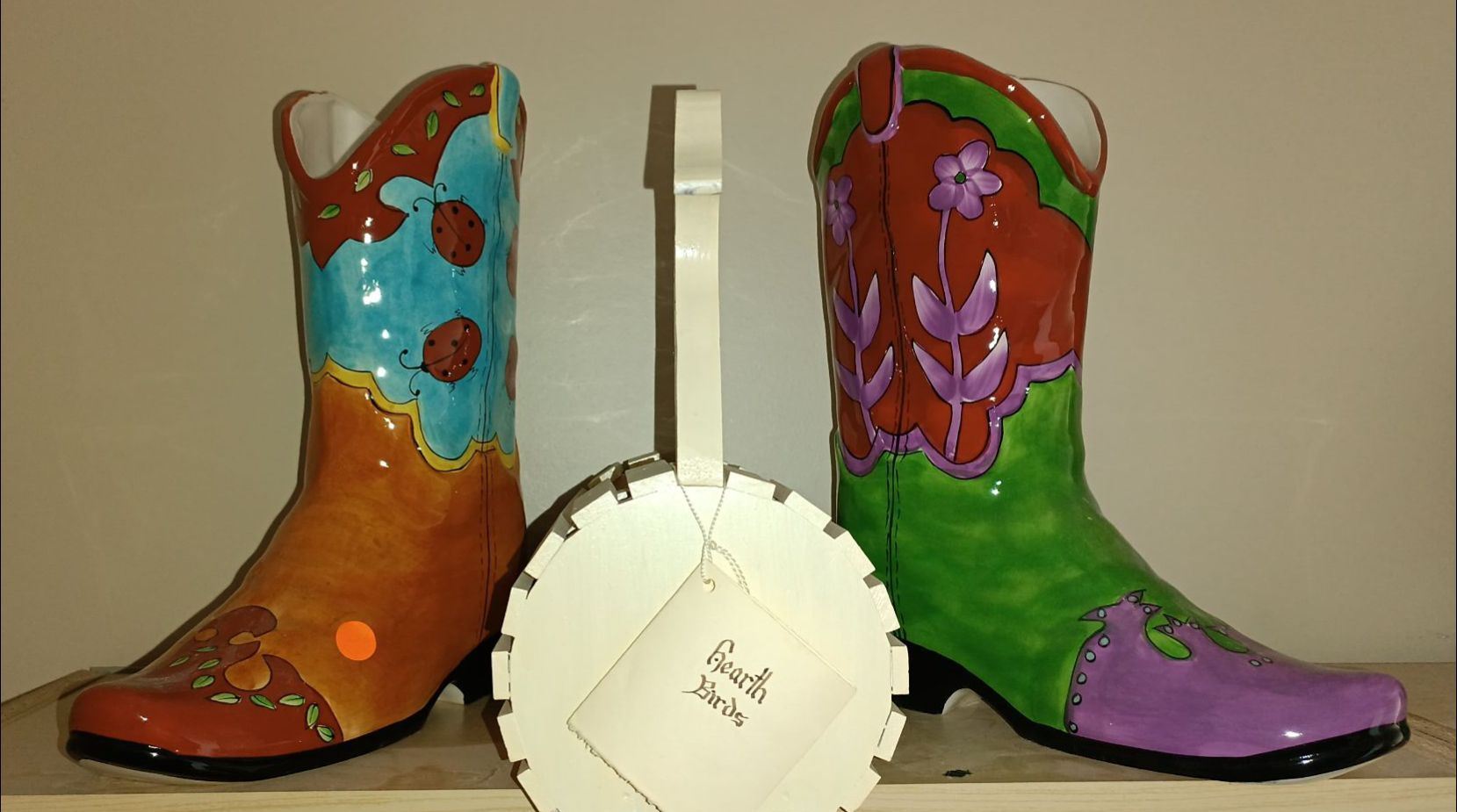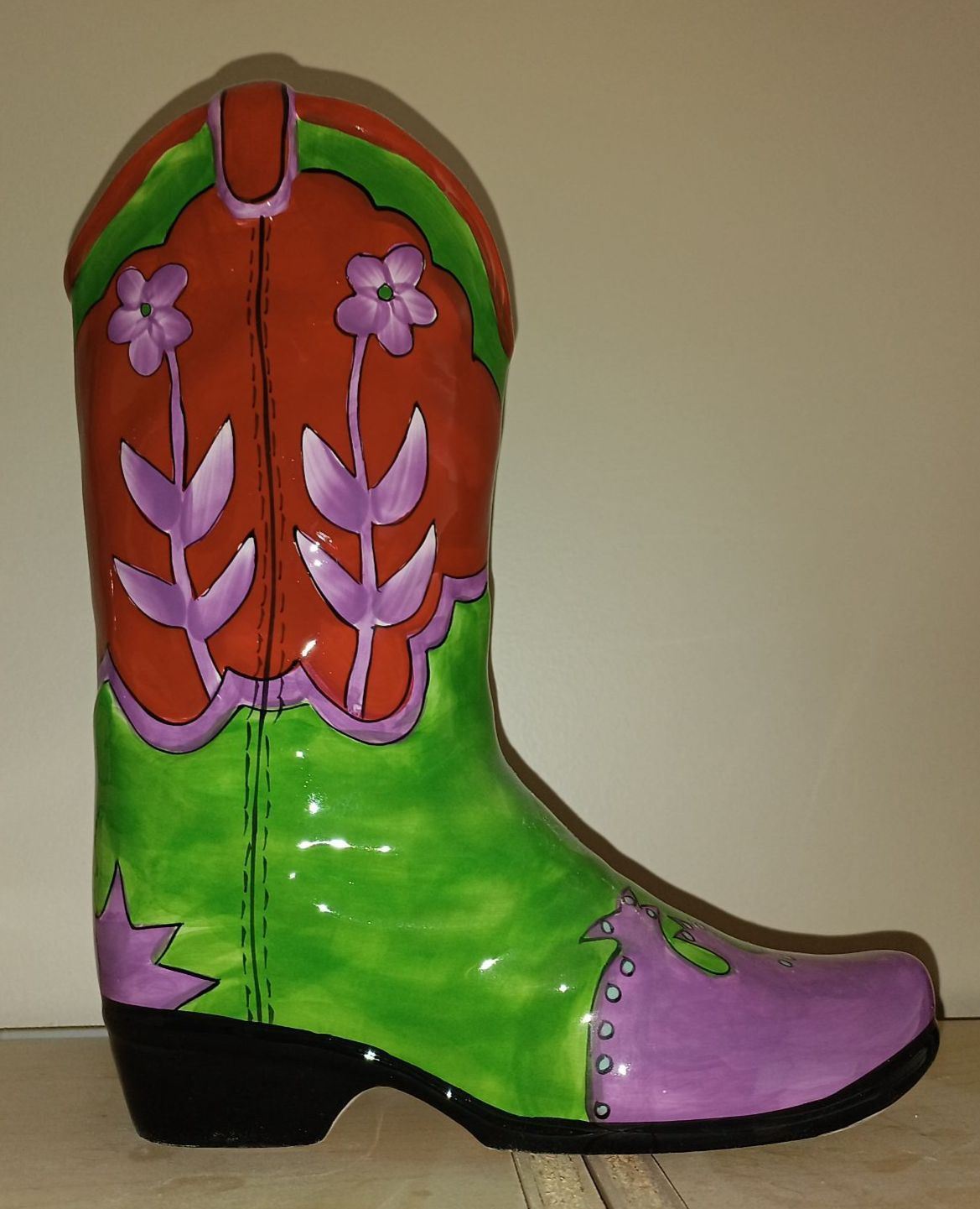 Large Pair Of Glass Cowboy Boots For Shelf 20" tall & Wooden Bird Basket