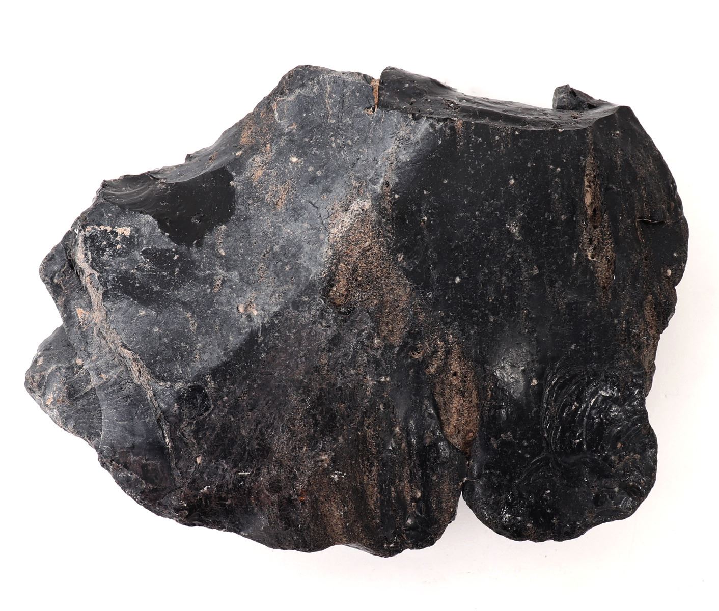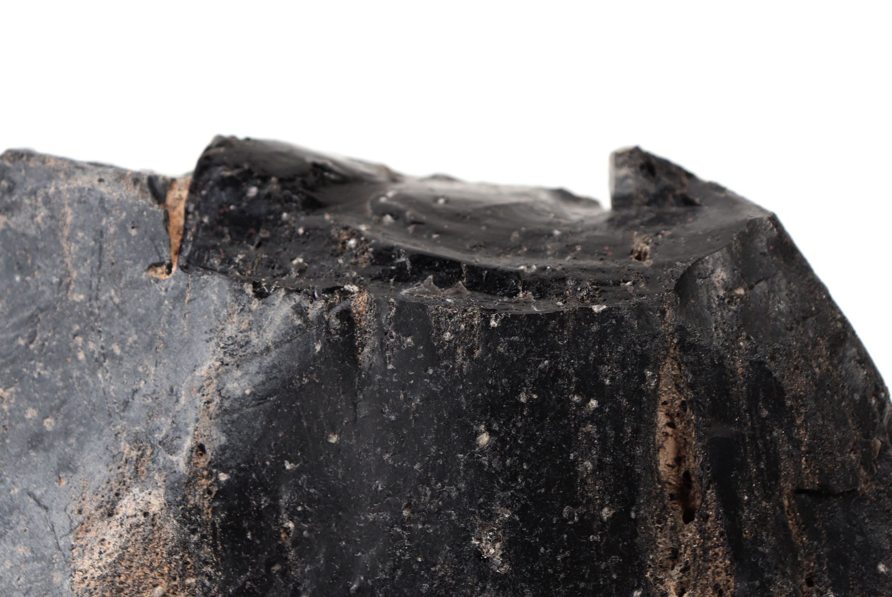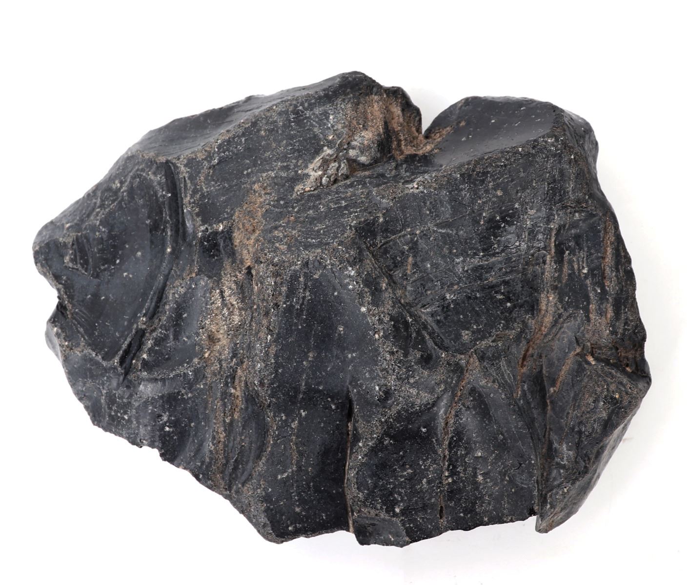 Wonderful raw section of pure natural obsidian in an unpolished raw shape with beautiful iron colored patina throughout as shown. Obsidian is formed when lava is cooled rapidly, generally when it runs into the ocean, pieces of obsidian or volcanic glass - will form. Size 8" L x 6" W, weight 1381g. Condition: Well preserved condition.