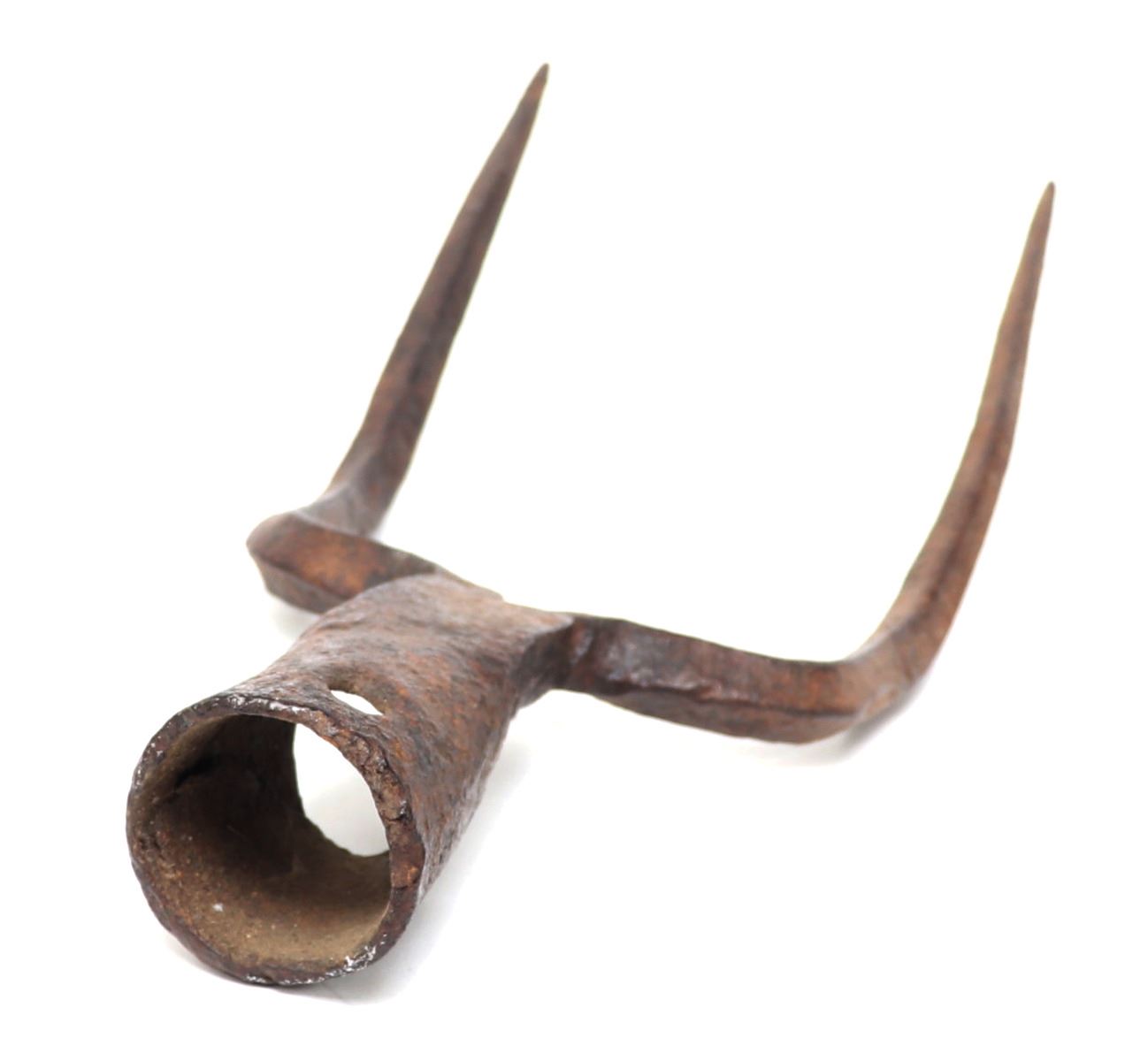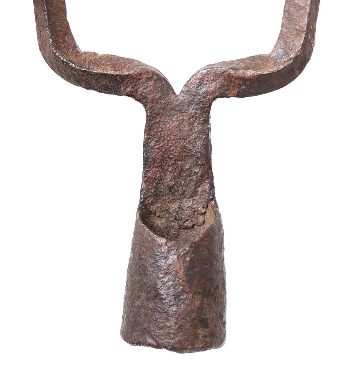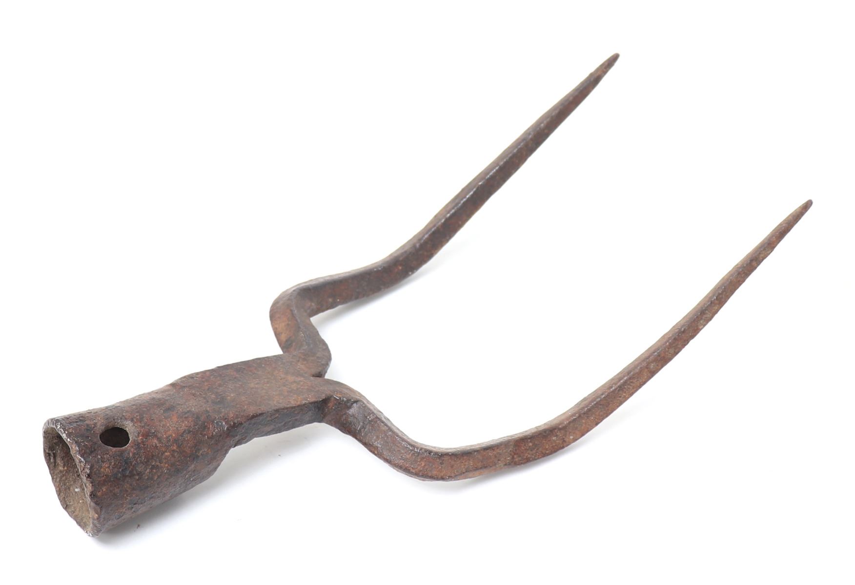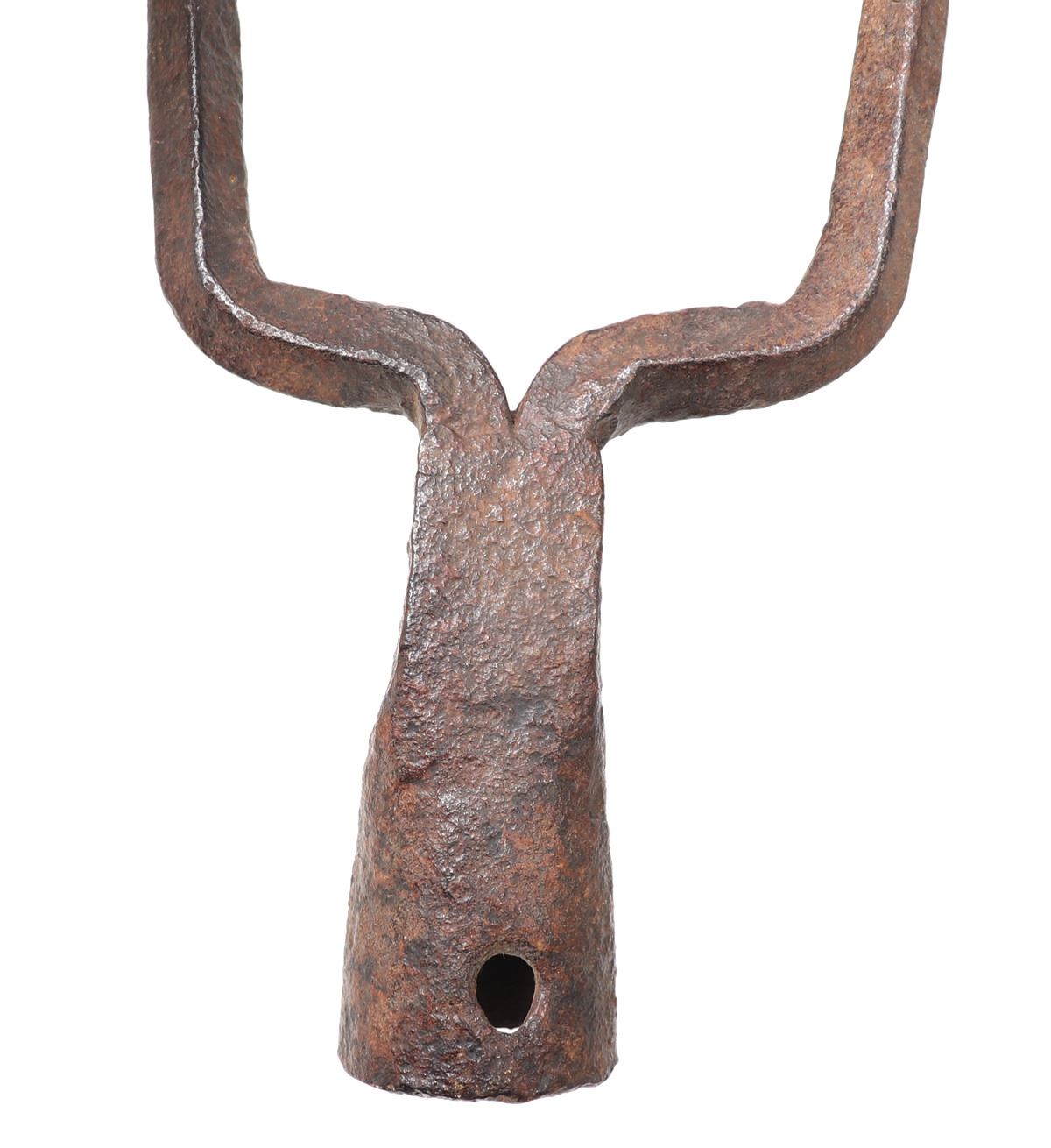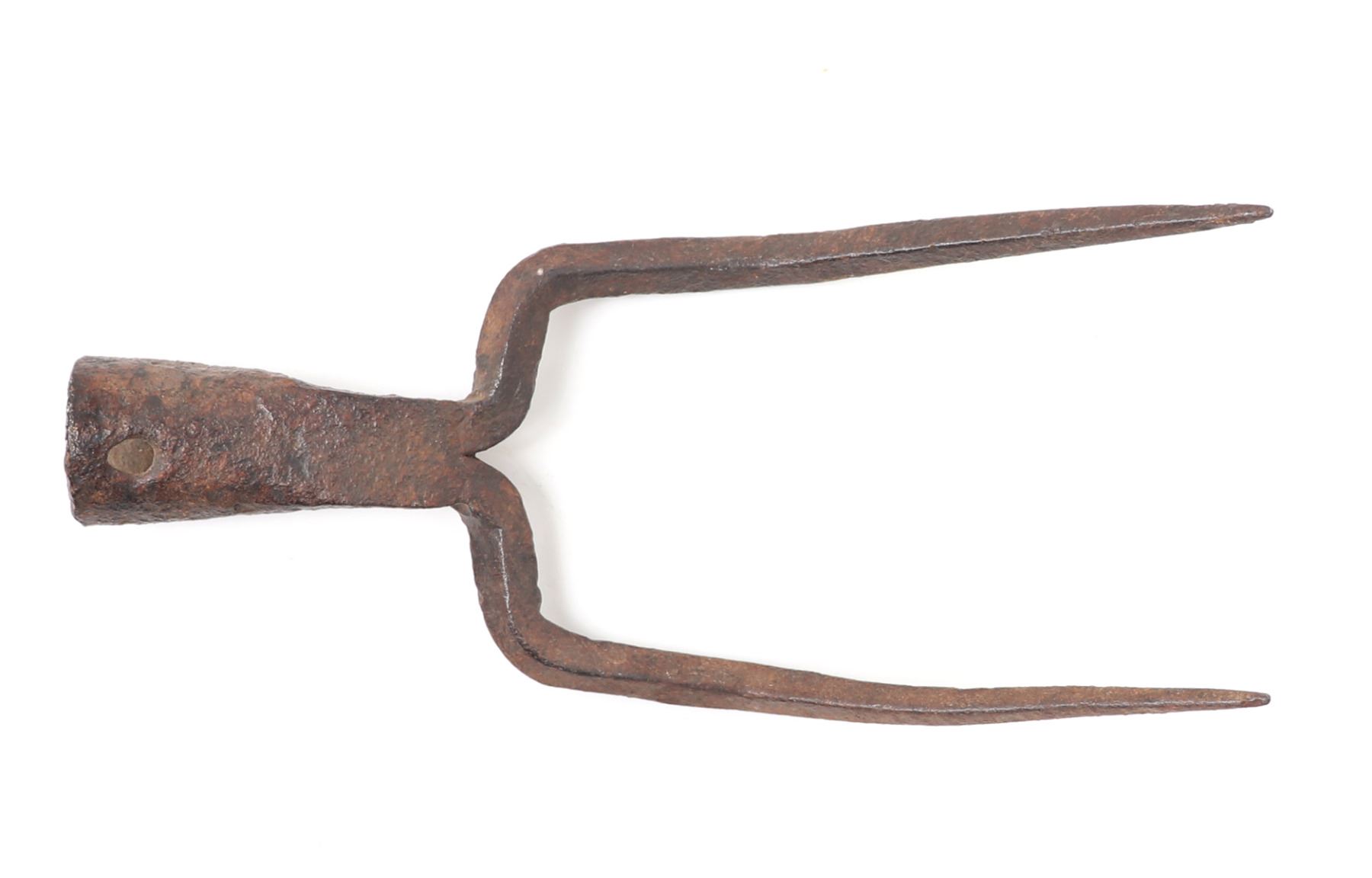 Spanish Colonial ironwork war fork of heavy construction in wrought iron, 18th century. Known as a poor mans polearm from workers utilizing a hay fork in battle. Size 12 3/4" L x 5 1/4" W. Condition: As-is condition with wear and patina throughout commensurate with age.. Provenance: Ex-New Mexico Ironwork Collection, Ex-Arizona Collection