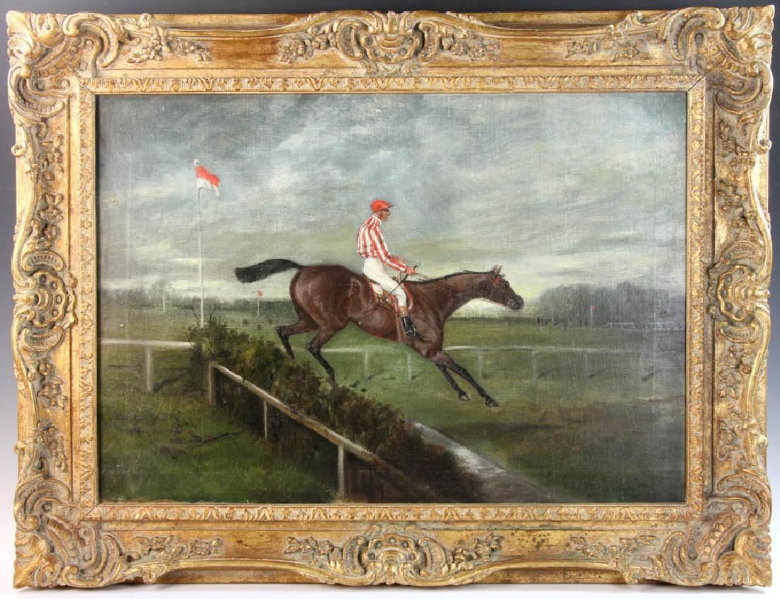 Late 19th century portrait of a horse clearing hedge, oil on canvas, initialed possibly JFC, German or Hungarian newsprint on back stretcher, 21" x 30", framed 28" x 38". Provenance: Palm Beach estate.