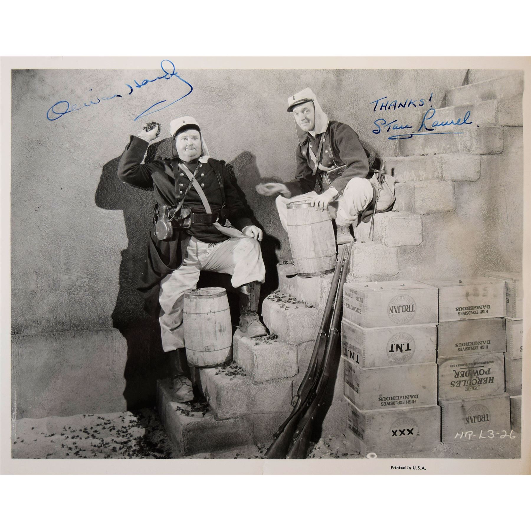 8 in. by 10 in. Black and white movie still photo autographed by Stan Laurel & Oliver Hardy. Signed: Thanks! Stan Laurel and Oliver Hardy.