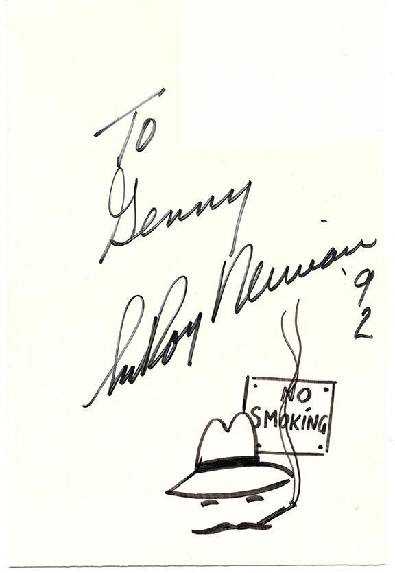 LeRoy Neiman signed original self portrait of his face, wearing a hat and smoking a cigar in a No Smoking Zone. Sketched on a heavy card, measures 6â€x9â€. Inscribed: “To Genny, LeRoy Neiman ’92.†In excellent condition