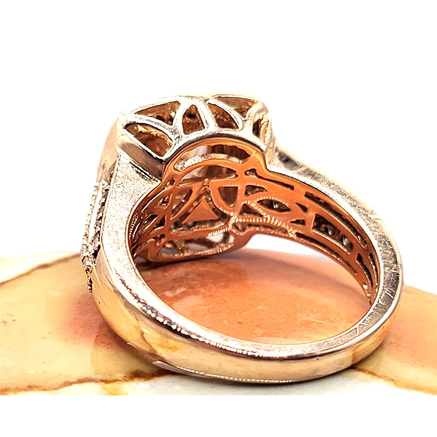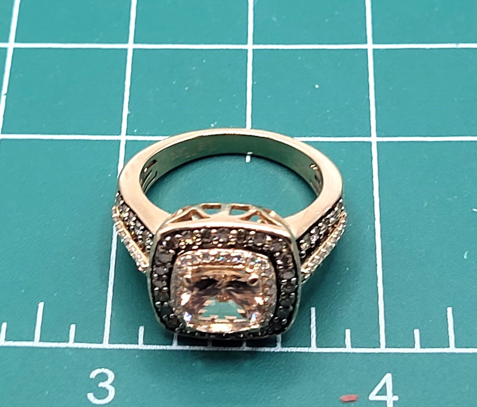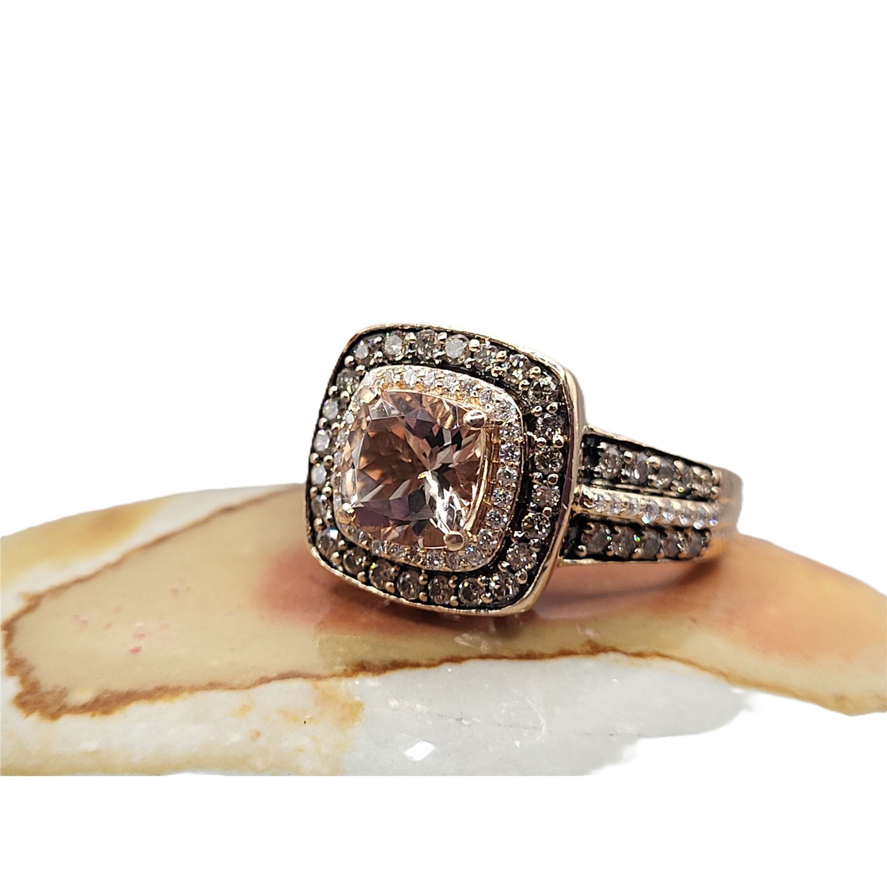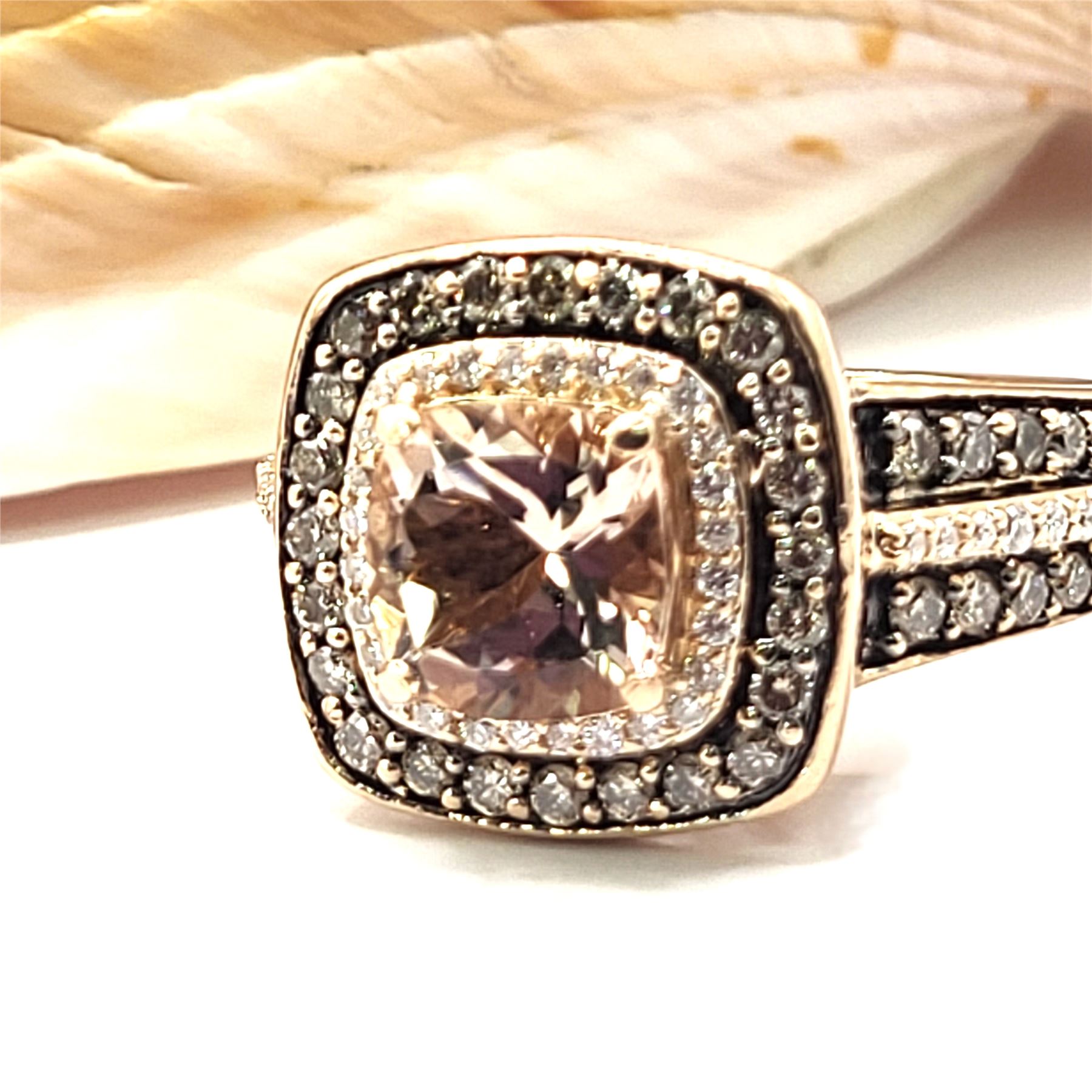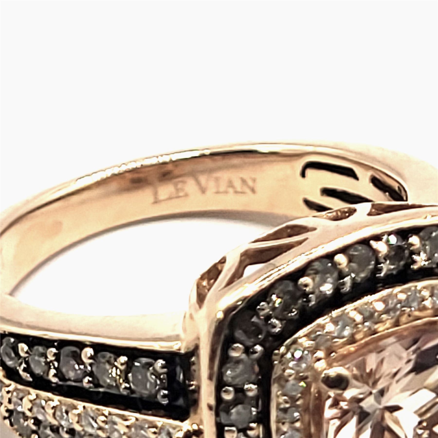 This 14 karat rose gold ring bears the LeVian hallmark and features an approximate 2.00 carat cushion-cut Morganite. The ring has a wide, cushion-shaped frame and wide, tiered shoulders, set with approximately 1.00 carats total weight of SI clarity chocolate and vanilla diamonds There is a supportive under gallery and raised trussed gallery. This ring is a US size 7 and can be sized for an additional charge. Please contact Bidfair Fine Jewelry for sizing details. Rest assured, the master jeweler Bidfair Fine Jewelry partners with for sizing will NOT destroy the hallmark. This item is eligible for appraisal at a discounted rate, from an independent appraiser (with qualifying credentials from GIA) with no affiliation to Bidfair Fine Jewelry. Please contact Bidfair Fine Jewelry for more information on appraisals and sizing. . Admin:33110/16irt