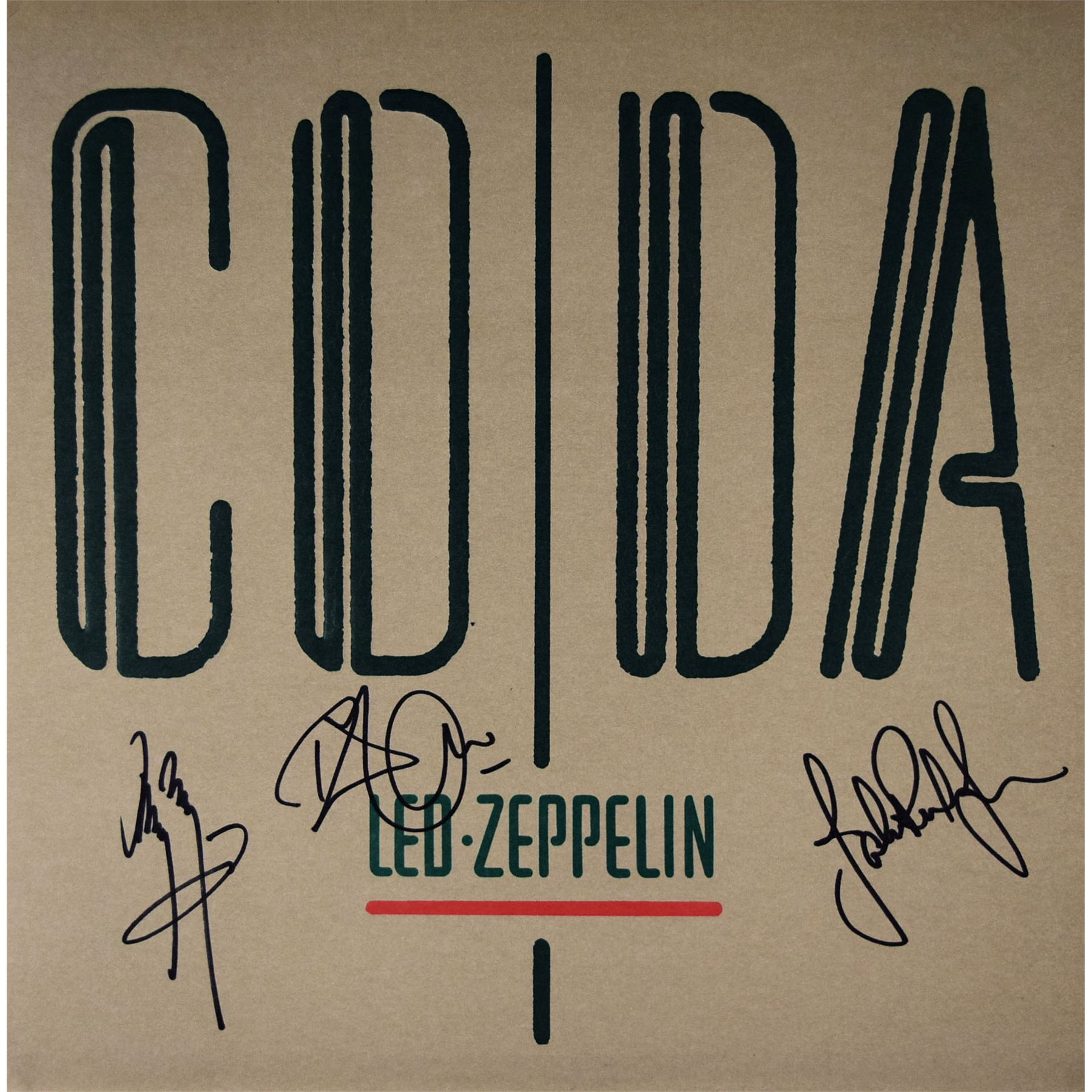 Led Zeppelin signed Coda album autographed by Robert Plant, Jimmy Page and John Paul Jones. 12x12 inches vinyl included