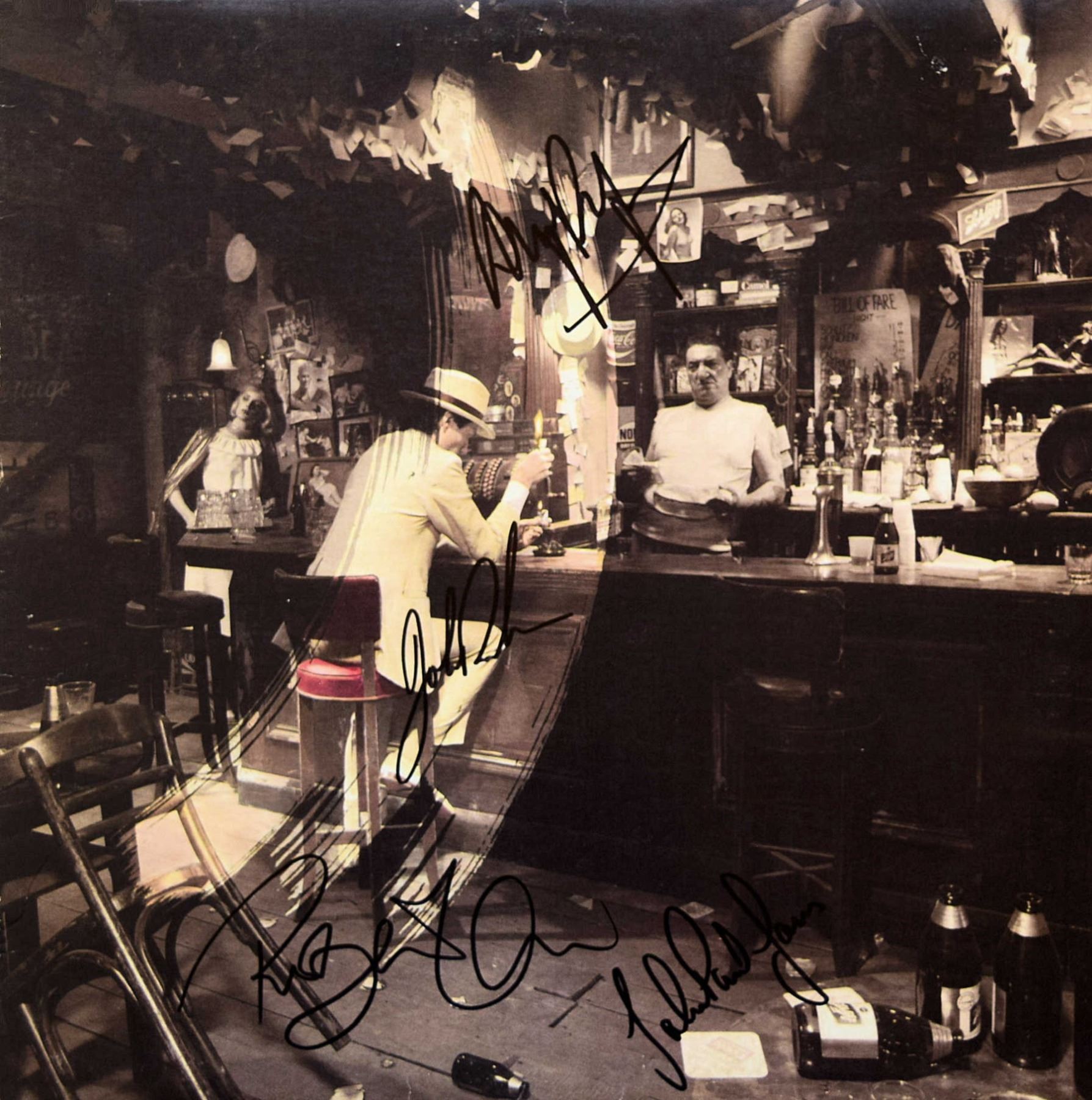 Led Zeppelin 1979 In Through The Out Door album. Signed: John Bonham, Jimmy Page, Robert Plant & John Paul Jones.