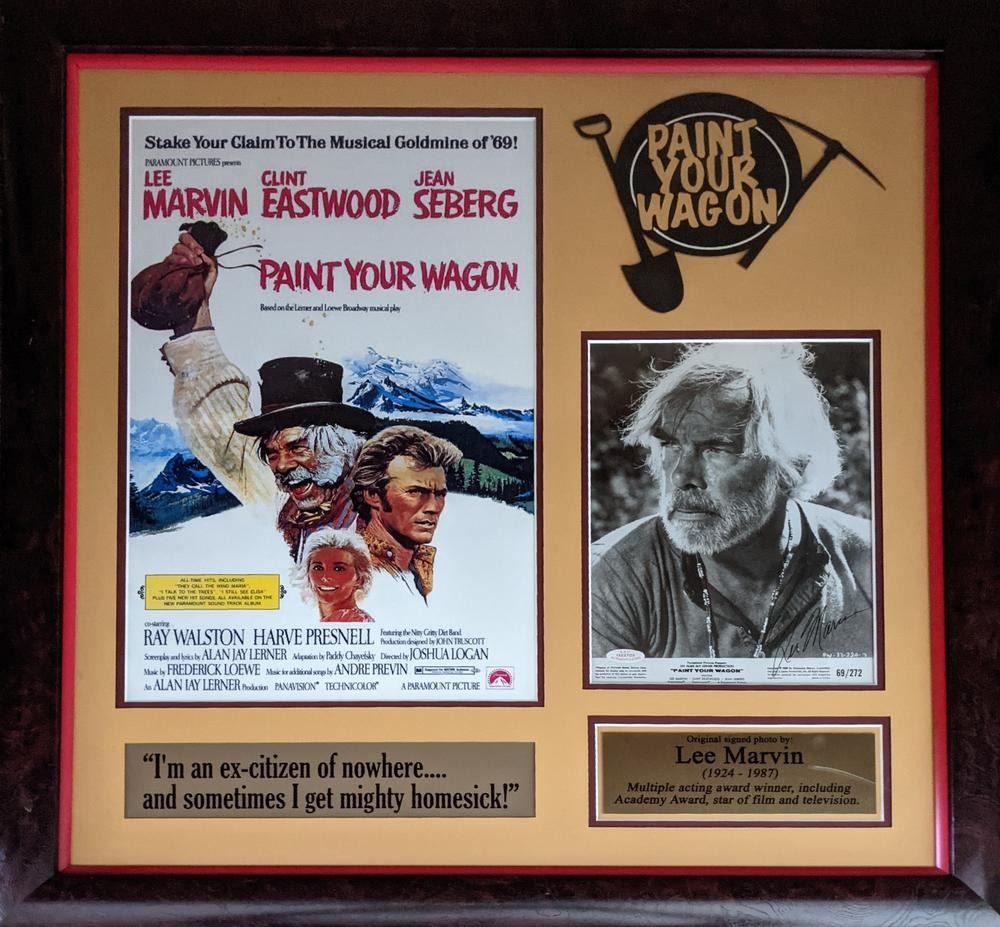 Lee Marvin Paint Your Wagon signed photo collage. Custom framed, This item is AAU forensically authenticated. 25x25 inches. . This item has some wear and tear on frame