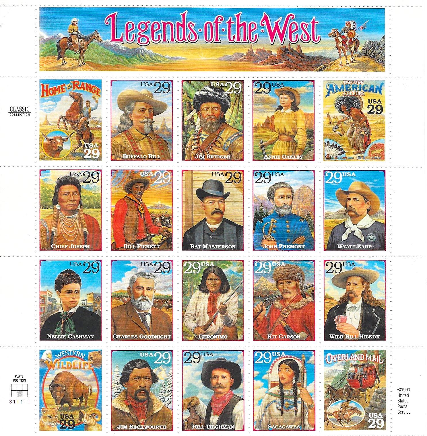 Legends of the West Complete Pane of Twenty 29 Cent Stamps Scott 2869