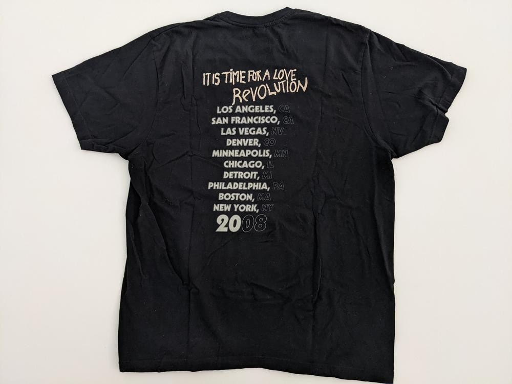 Lenny Kravitz 2008 Love Revolution US Tour Shirt Size XL. 100% cotton black short sleeved t-shirt. Original official tour merchandise. On the front in gray is a picture of Lenny, below says “Lenny Kravitz”. On the back in off white is “It Is Time For A Love Revolution”. In gray are the cities on the tour and “2008”. Excellent vintage condition, never worn. Approximate measurements are 24 inches (61 cm) pit to pit, 30 inches (76 cm) long shoulder to hem, 25 inches (63.5 cm) across bottom.