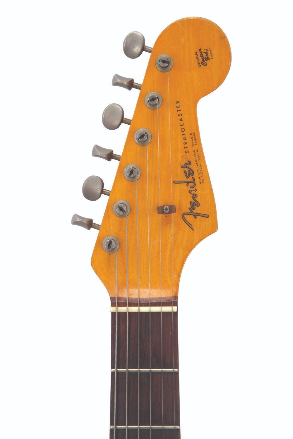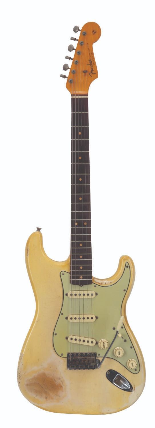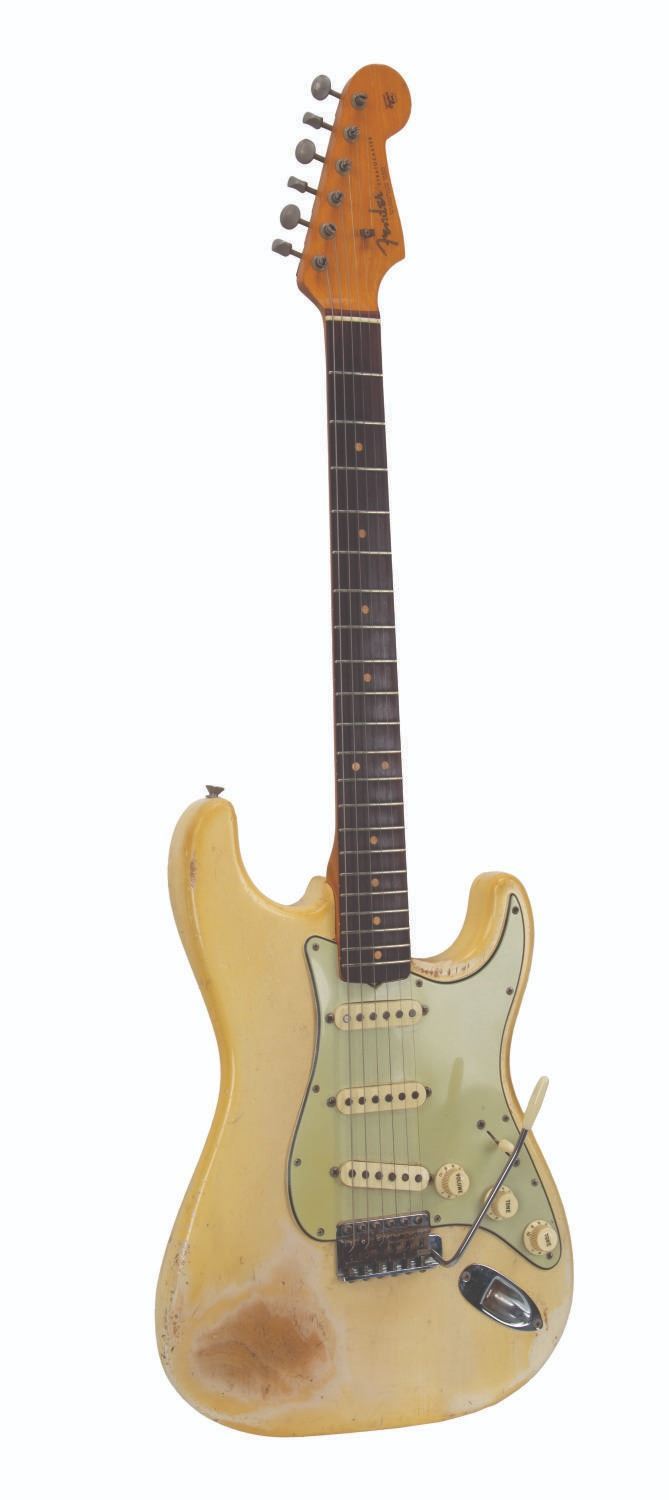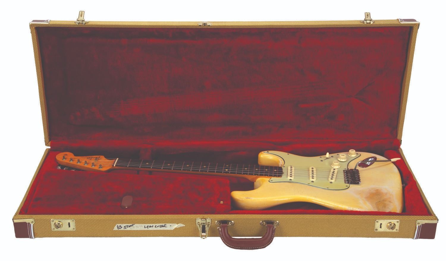 (Fender, 1963) Leon Russell’s 1963 Fender Stratocaster. A talented songwriter and musician, Russell played with countless legends over his 60-year career including Bob Dylan, Frank Sinatra, Elton John, Eric Clapton, and the Beach Boys. This ’63 Strat six-string electric guitar from the two-time Grammy winner bears the serial number L07046. Measuring 38.5” x 13” x 3” in a 41.5” x 15” x 4.5” guitar case, the guitar is in fair condition with scuffs, stains, wear from use, and heavy discoloration from age.