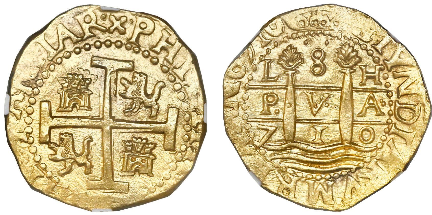 Lima, Peru, cob 8 escudos, 1710H, NGC MS 63, ex-1715 Fleet (designated on label).