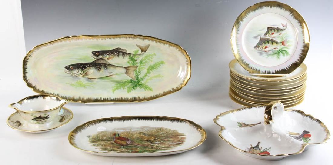 Limoges, France, porcelain fish service to include large fish platter, 21 1/4" L, twelve (12) plates, 9 1/2" diameter and sauce dish with undertray, together with a handled three-section serving dish with seafood motif and platter with pheasant motif 14 3/4" L. Provenance: Salem, Massachusetts estate.
