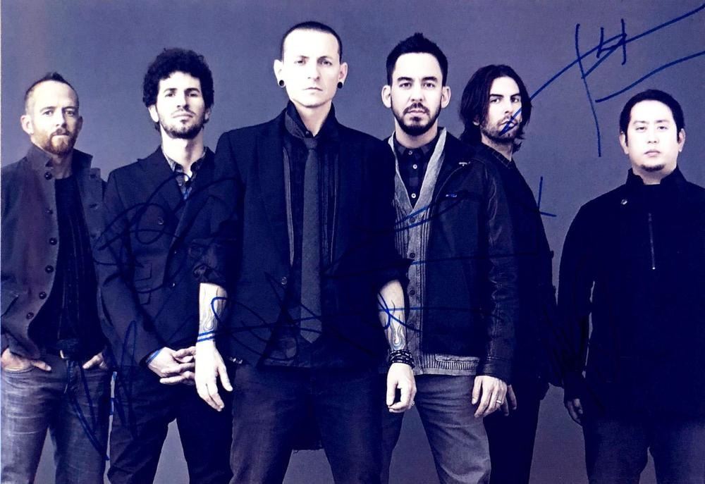 Linkin Park facsimile signed photo autographed by Joe Hahn, Dave Farrell, Brad Delson, Mike Shinoda, Rob Bourdon, and Chester Bennington. 8x10 inches. This item is a reprint of an original autograph.