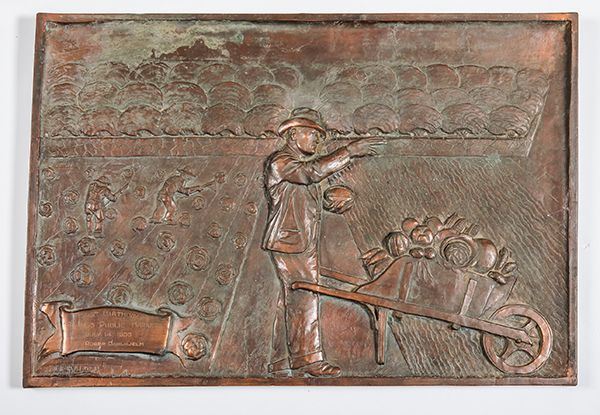 [los Angeles' Farmers Market] 1935 Plaque Commemorating 1st Birthday. Bronze plaque, 24� x 16� in., created by artist J.E. Balogh and presented to Roger Dahlhjelm, one of the founders of the Los Angeles Farmers Market, to commemorate the first birthday of the Market on July 14, 1935. A small plaque at lower left says, "First Birthday / Farmers Public Market / July 14, 1935 / To Roger Dahlhjelm." The artist signed at lower left, with "L.A." after his name.
