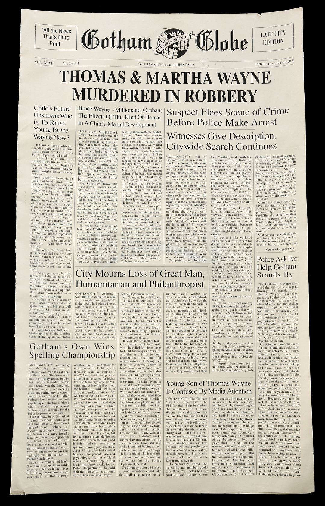 A Gotham Globe "Thomas & Martha Wayne Murdered in Robbery" newspaper from Tim Burton's superhero sequel Batman Returns. The Gotham Globe describing young Bruce Wayne witnessing the murder of his parents was unseen in the final cut of the film.