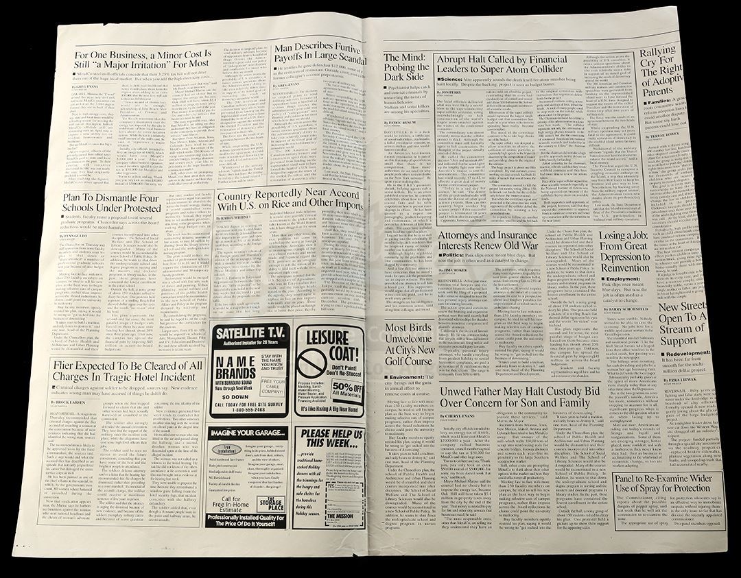 This four-page newspaper sheet features seven articles on the cover, six of which include headlines highlighting the murder and its impact on Gotham City, as well as two Gotham-related headlines on the reverse. The newspaper is printed in black ink on uncut newspaper stock.